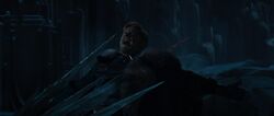 However, as the battle raged on, Fandral was grievously injured when a Frost Giant impaled him and had to be carried clear. As Volstagg carried Fandral away, they were then chased down by an Frost Beast which was killed by Thor. Before Laufey's forces could finish them off once they had them cornered, the Asgardians were saved by the timely arrival of Odin on Sleipnir, who intervened and quickly had them all quickly withdraw back to the safety of Asgard.[1]