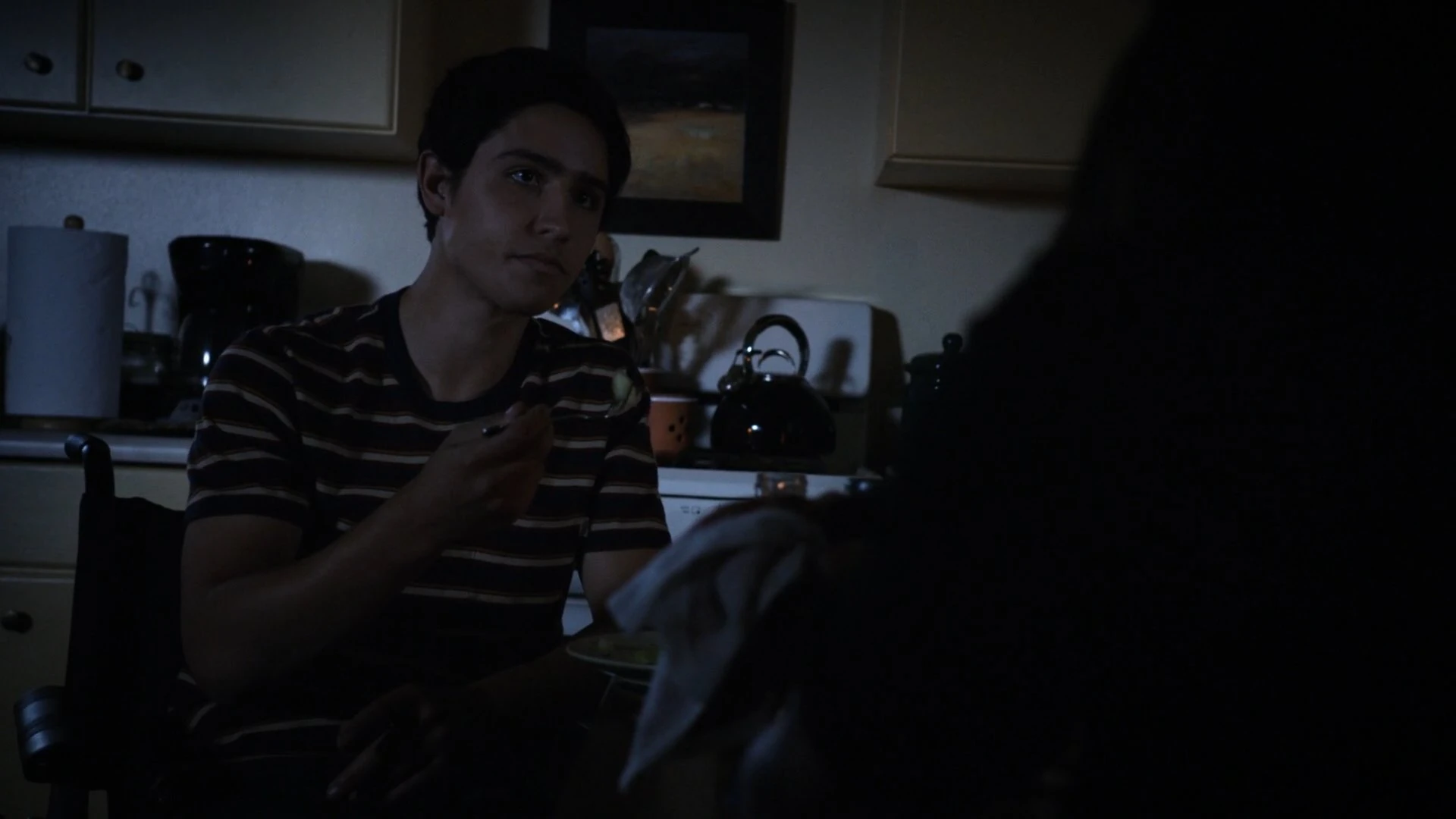 With the night falling, Gabe lighted some candles across the house. When Robbie left, Gabe stayed at the Reyes Residence with Johnson, offering her some meal. They discussed about Robbie and his relationship with Gabe. Gabe voiced his concerns about his brother's mysterious night activities and that Johnson could have bad influence on him. As Johnson's wounds did not seem to recover, Gabe told her that he knew why she did not want to go to the hospital since he had identified her as Quake. Gabe promised that he would not disclose Johnson's secret identity to anyone provided she never came near Robbie again. Quake agreed to leave and Gabe remained alone in the house until his brother returned.[3]
