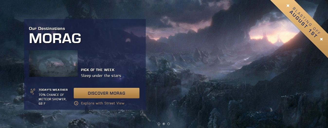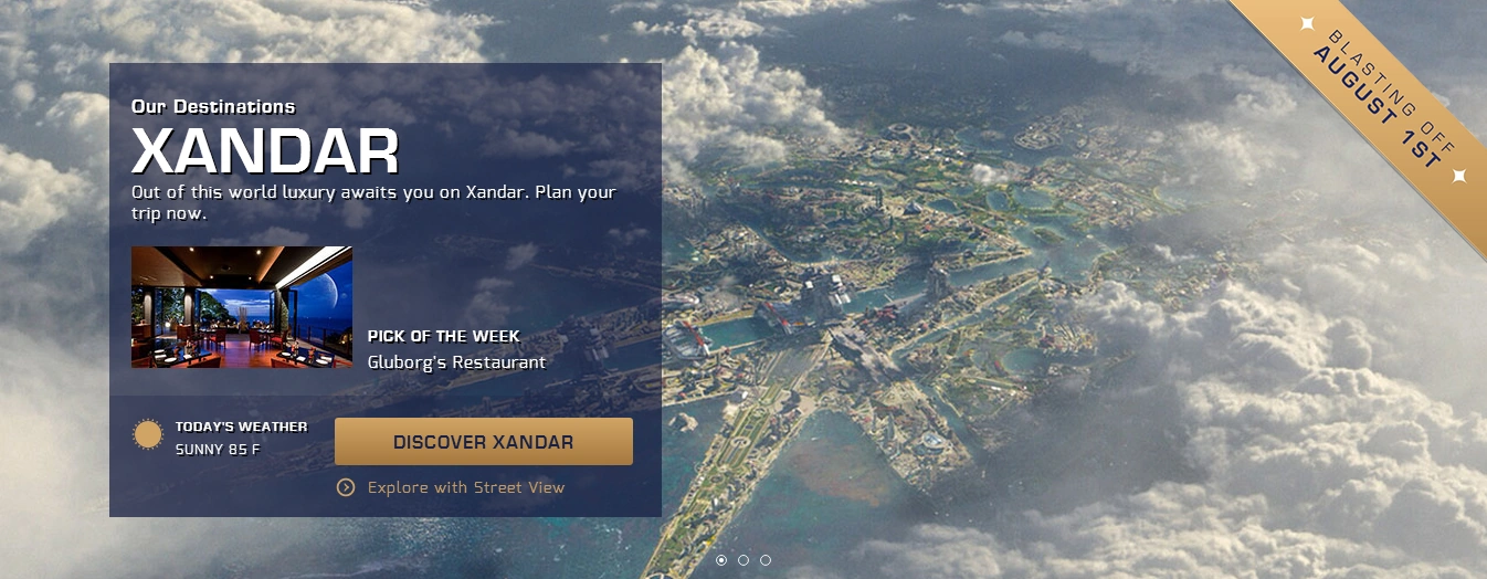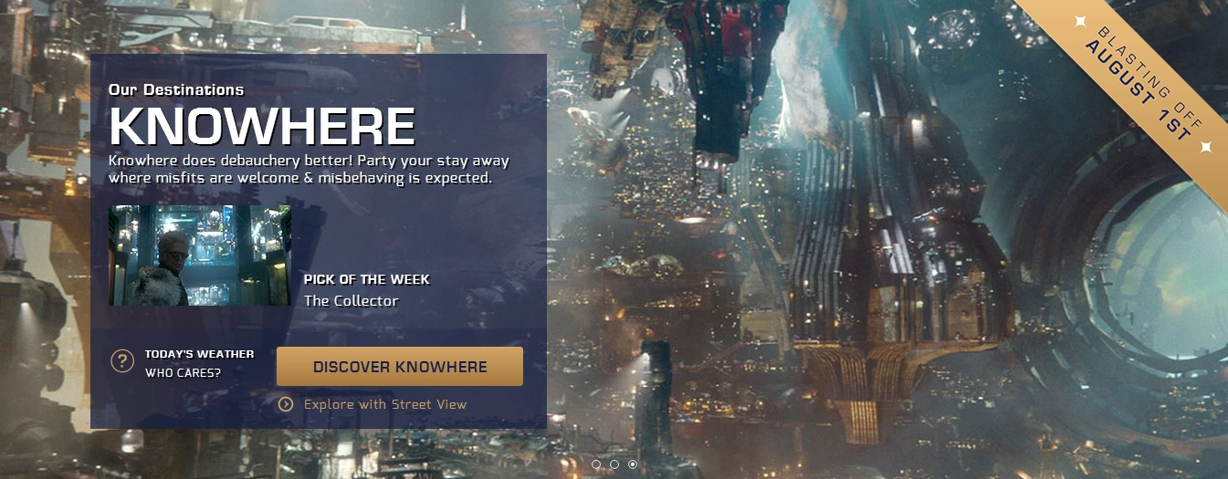 Galaxy Getaways is a Galactic travel agency created by Marvel that introduces otherworldly destinations. The website was released on July 3, 2014, to promote Guardians of the Galaxy; however, it is no longer active. Visitors could book a ticket to three exotic and unique destinations: Xandar, Morag and Knowhere. Each planet could be explored with Street View and users could pick up travel tips or learn about the local knowledge. The site also featured an 'I am Groot' mini game, where you had to find Groot hidden in the surrounded flora and there was a quiz called 'Which type of galactic traveler are you?'