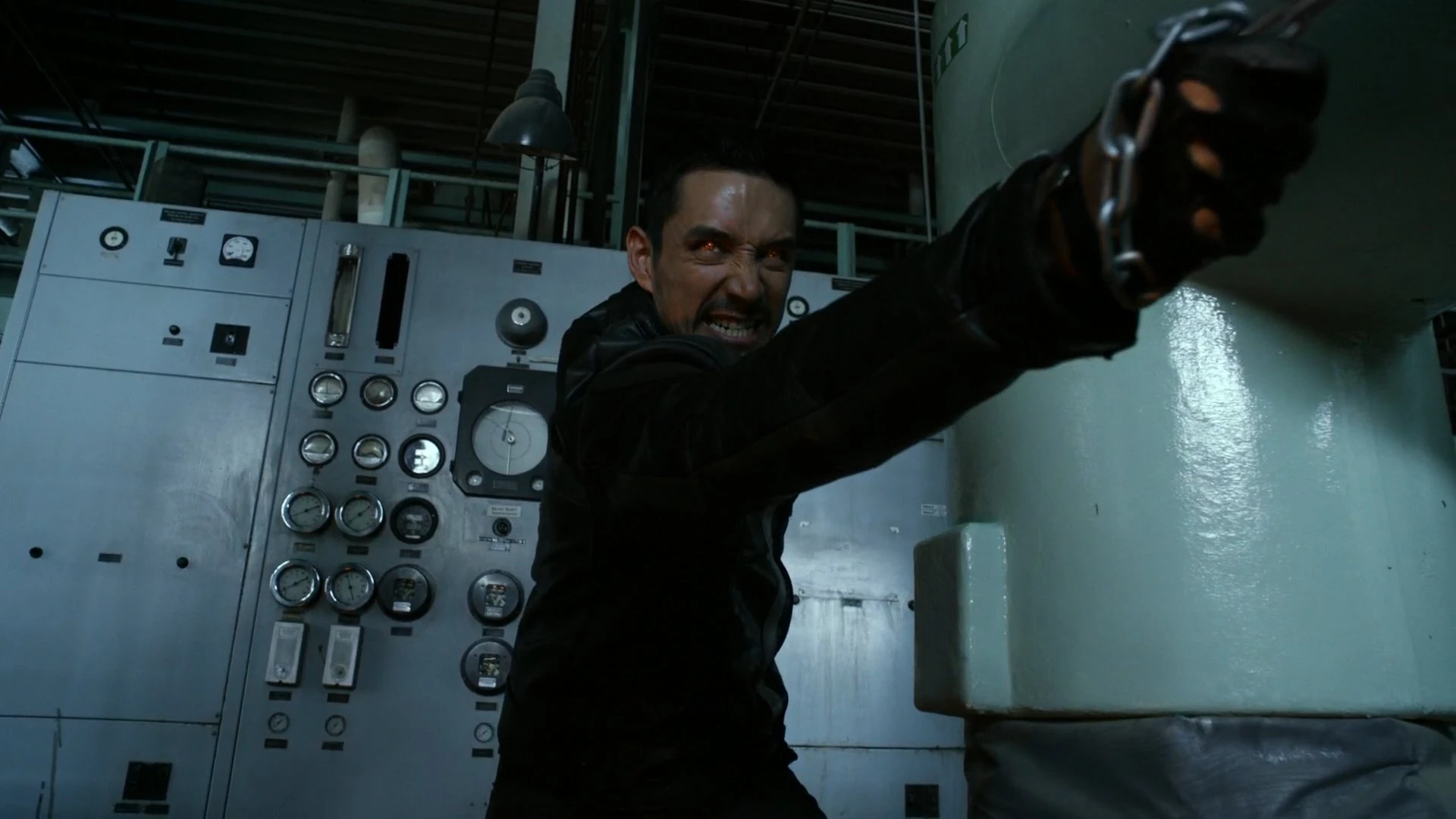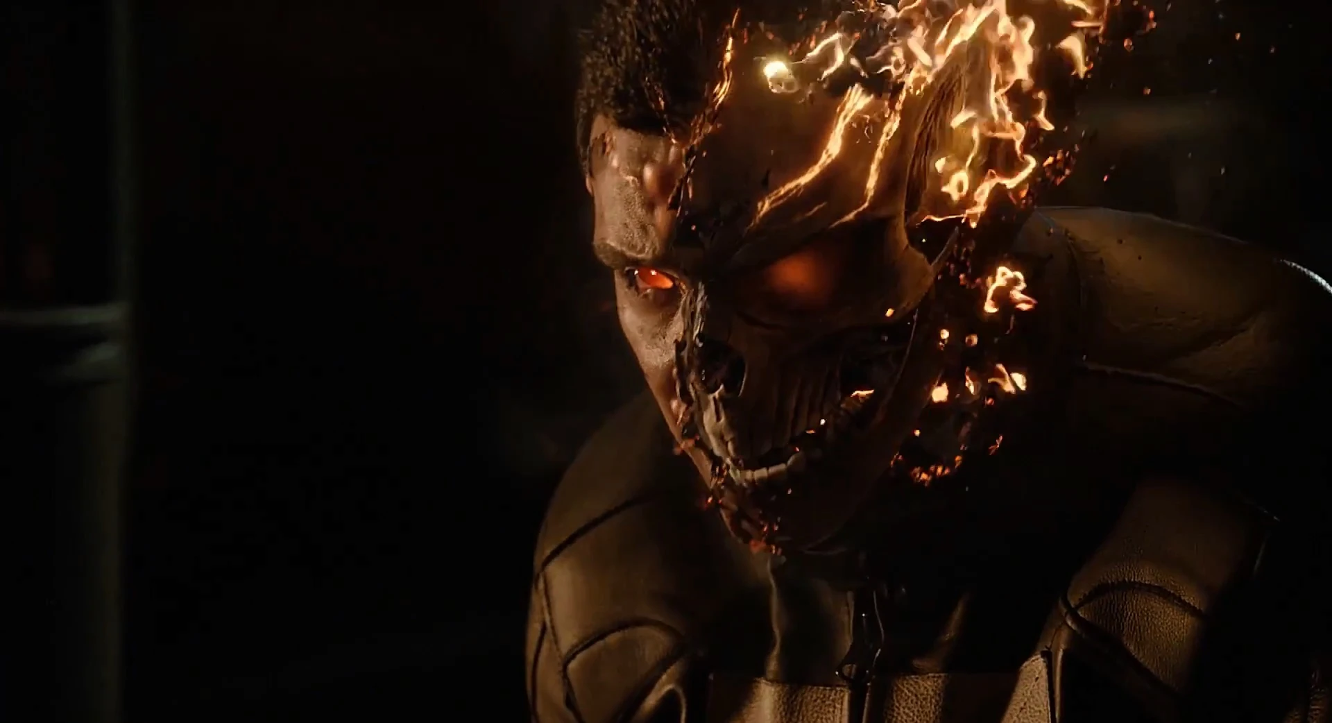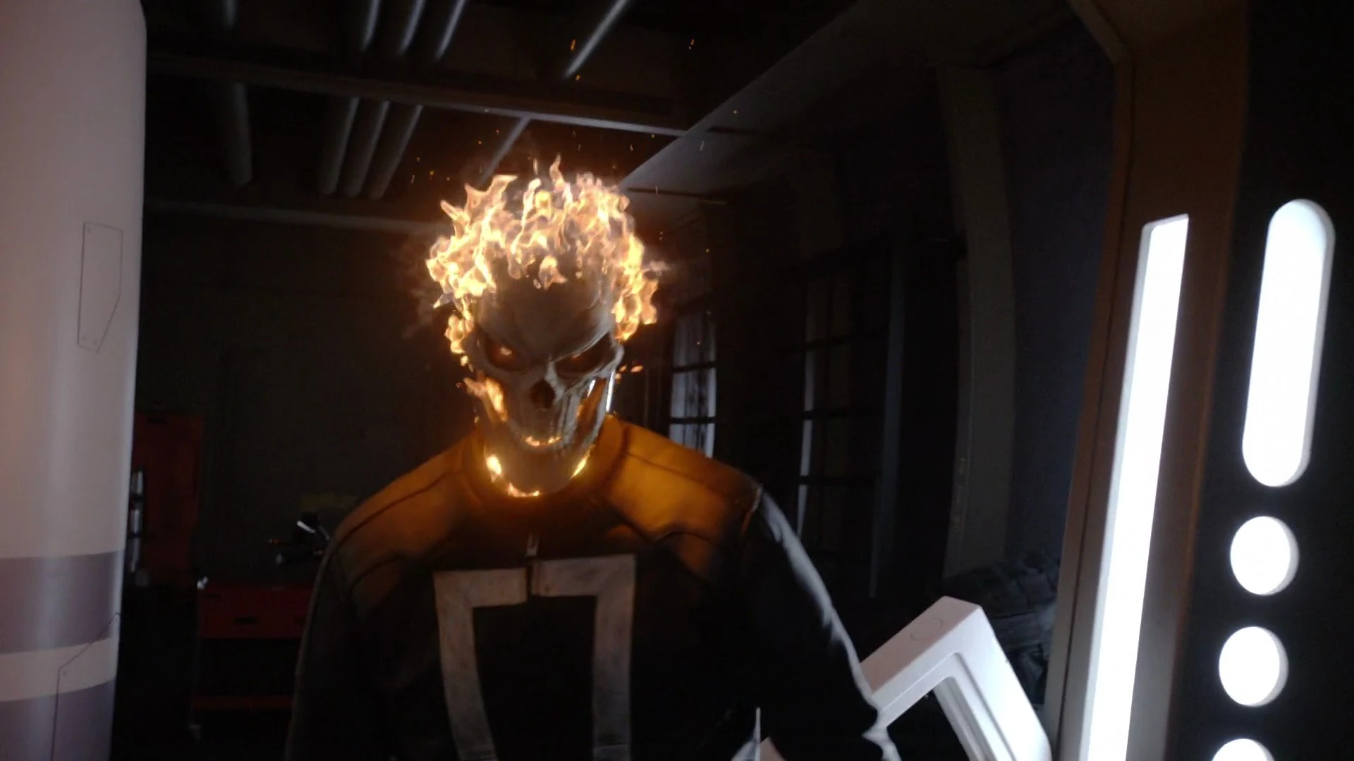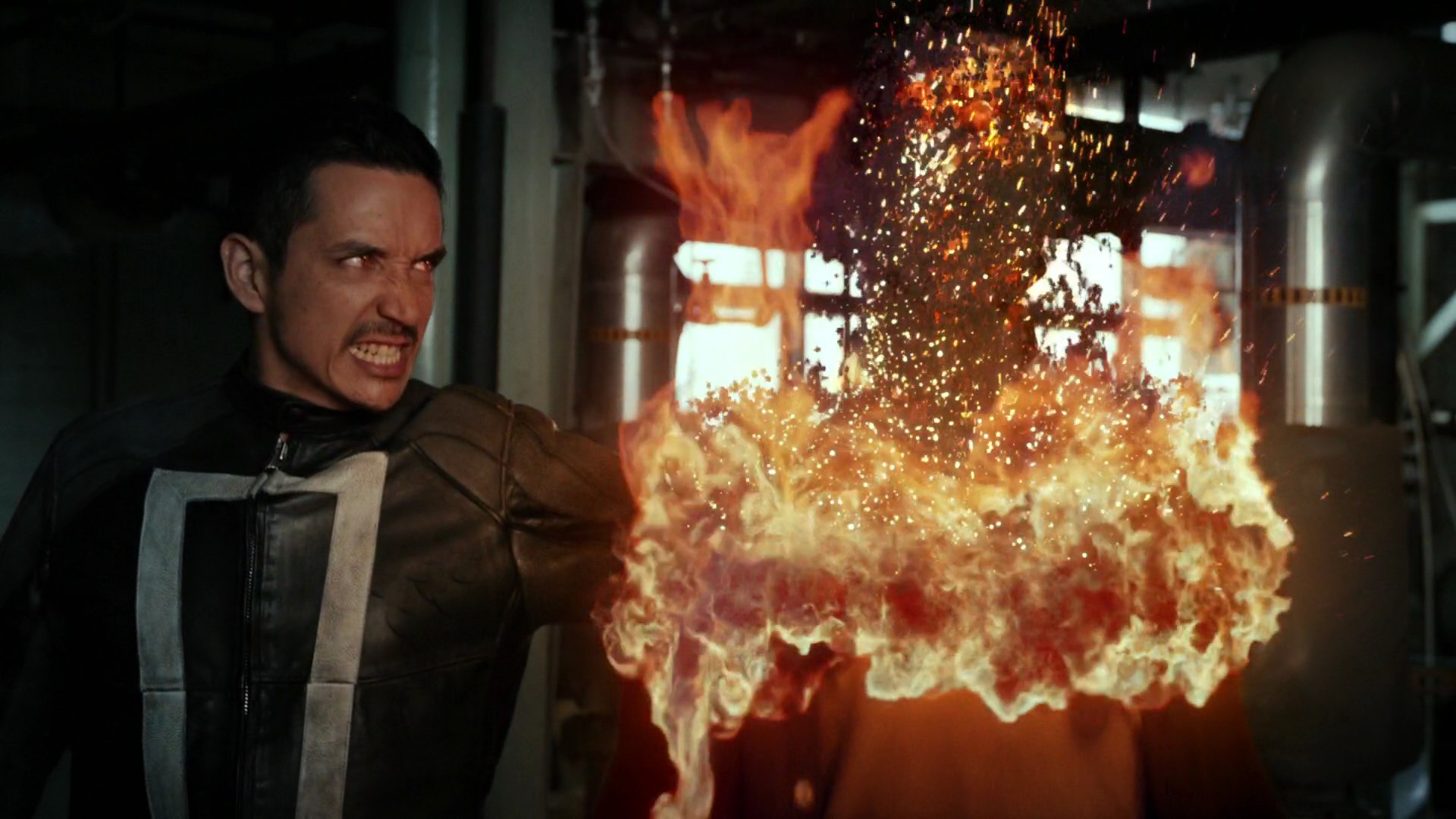 Arriving at Momentum Labs, Reyes found Frederick who was close to killing Leo Fitz, having locked Alphonso Mackenzie inside a radiation reactor core. Just as Reyes pulled Frederick away from Fitz in time and bypassed his intangibility, Frederick looked at him straight in the eyes, with his own eyes burning red with fire. Just as Frederick questioned what Reyes was, he gave out a roar and transformed himself into Ghost Rider, much to Fitz's horror as he looked upon Ghost Rider's completely terrifying burning skull and yellow eyes.