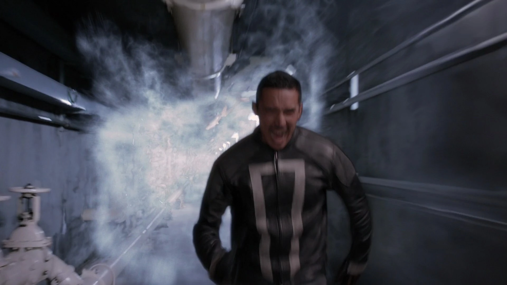 With Bauer finally dead and the threat she posed against the world seemingly over, Reyes attempted to return to the Quinjet while Coulson and May found and rescued his uncle and reclaimed the Darkhold. However, as Reyes ran through the Power Plant's hallways to freedom, he was chased down by a blast of incredible energy from the center of the plant, which soon engulfed not only Reyes but also Coulson and Leo Fitz before they could escape, seemingly destroying all evidence of them as the Power Plant disappeared of all life, leaving only silence remaining.[4]