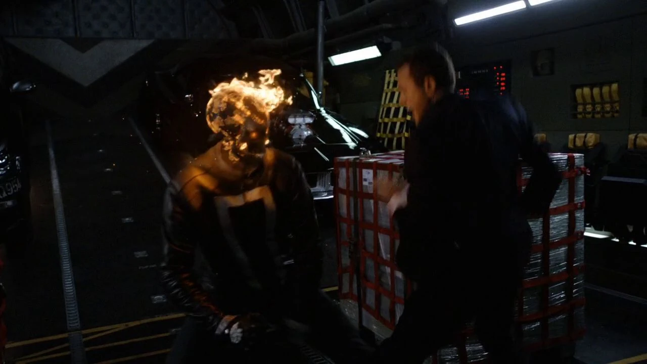Targeting the man keeping him from vengeance, Ghost Rider then attacked Director Mace, only to discover the Director had incredible strength and durability. Ghost Rider was launched across Zephyr One but continued fighting against the Director, who insisted upon being the one to battle him. Before long, Ghost Rider managed to pin Mace against a staircase and began hitting him repeatedly, attempting to beat him to death and refusing to stop even when Coulson tried to pull him away, throwing Coulson back in his fury for vengeance against Director Mace.