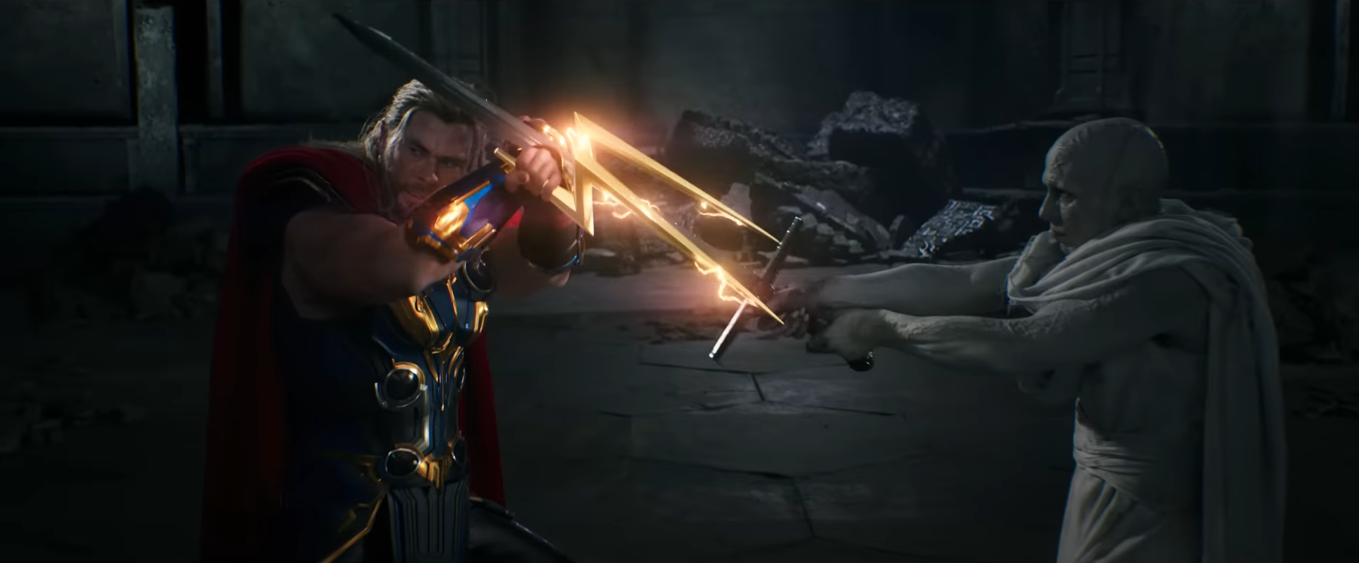 Noticing Thor's arrival behind him, Gorr summoned more Shadow Monsters to protect him so that his mission would not be interrupted. Thor got pass the Shadow Monsters and confronted Gorr, so the two fought. Gorr managed to disarm Thunderbolt from Thor and was able to overpower him, beating Thor to the ground. To finish Thor off, Gorr went to stab him through the chest with All-Black the Necrosword, but Thor managed to catch the sword. As Gorr pushed the Necrosword downwards, he was knocked away by Mjølnir.