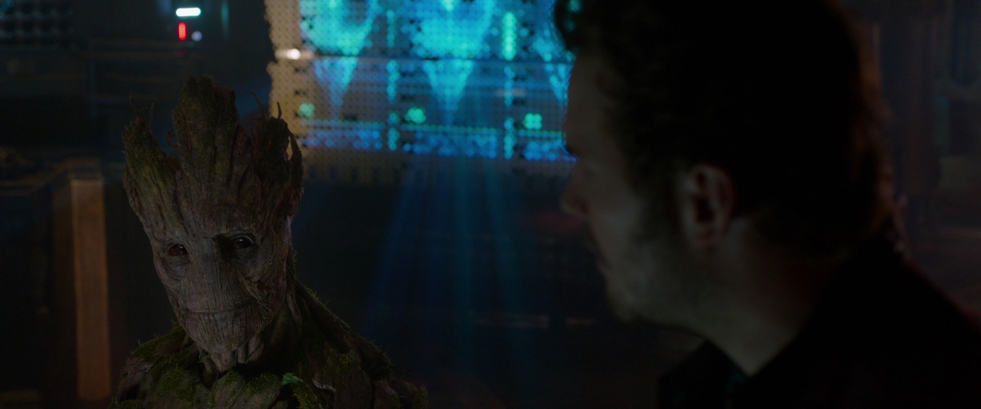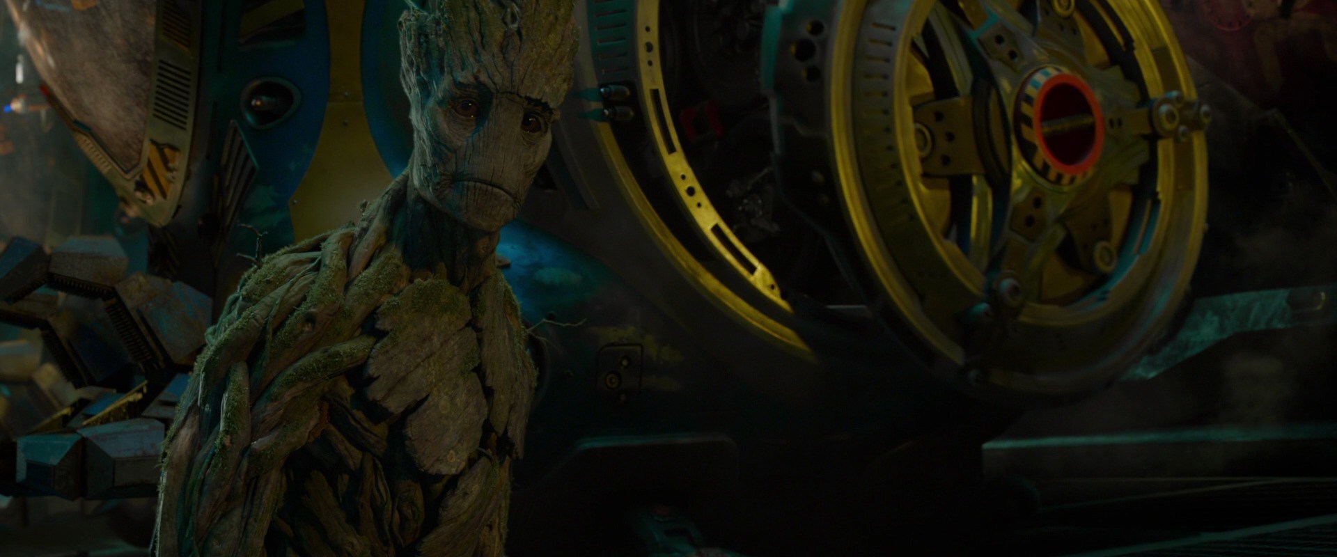 Gamora revealed to the group that she was planning on betraying Ronan the Accuser and selling the Orb to a third party. Groot began to speak to the group, which angered Quill into wondering why he could only say three words. Rocket noted that Groot doesn't speak well like the people like him and Quill, as his vocabulary is restricted to I, am, and Groot. Once Quill confronted the guard and demanded his Walkman, Groot watched as the situation had escalated.
