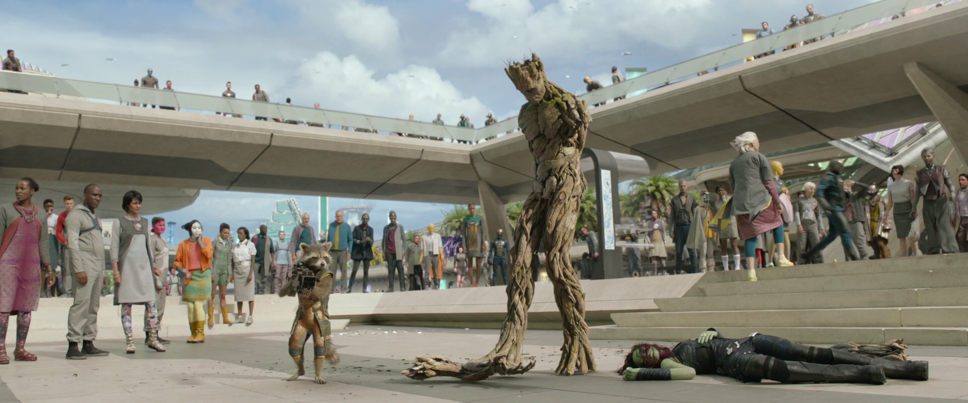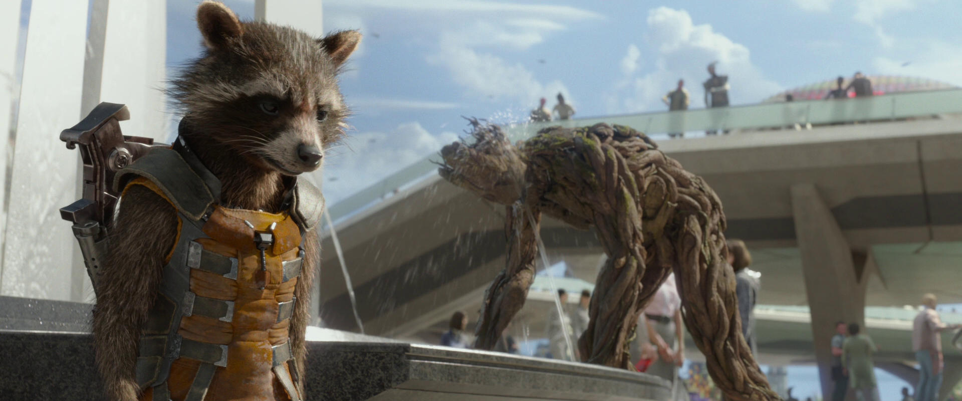 Groot traveled to Xandar with Rocket Raccoon where they seek out bounties to capture in a crowded plaza. While Rocket was looking at the many Xandarians, Groot began drinking out from a fountain but was quickly caught by Rocket. Groot tried to tell Rocket that he wasn't drinking from the fountain, despite of lying from his mannerisms.