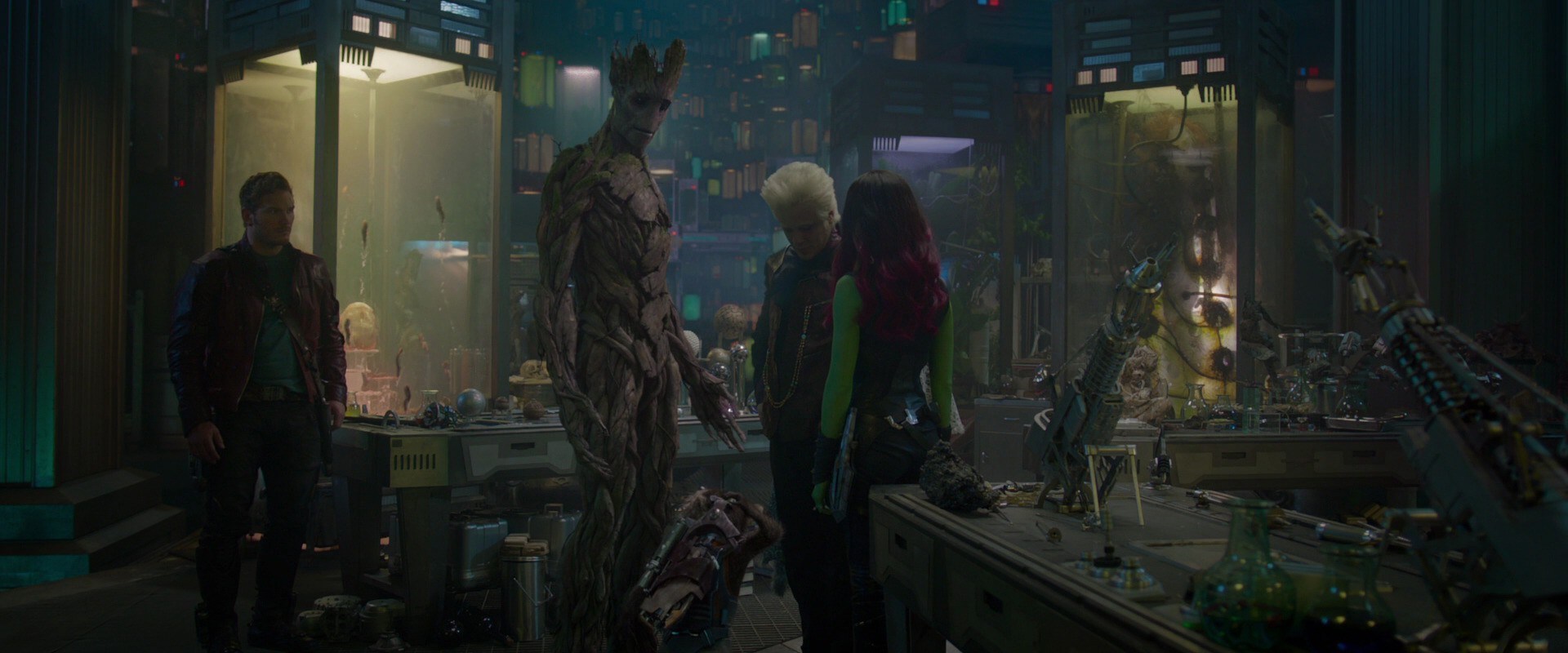 While Quill was fighting off Gamora, who was attempting to steal the Orb, Groot grabbed a sack and grappled his roots onto Gamora, however, Rocket told him to capture Quill. In pure rage, Gamora threw Rocket across the plaza, disarmed Quill from the Orb, and used her Godslayer sword to graze Groot's forearm. Once Quill apprehended Gamora from her possession of the Orb, Groot then captured Quill with the sack and followed Rocket to collect the bounty.