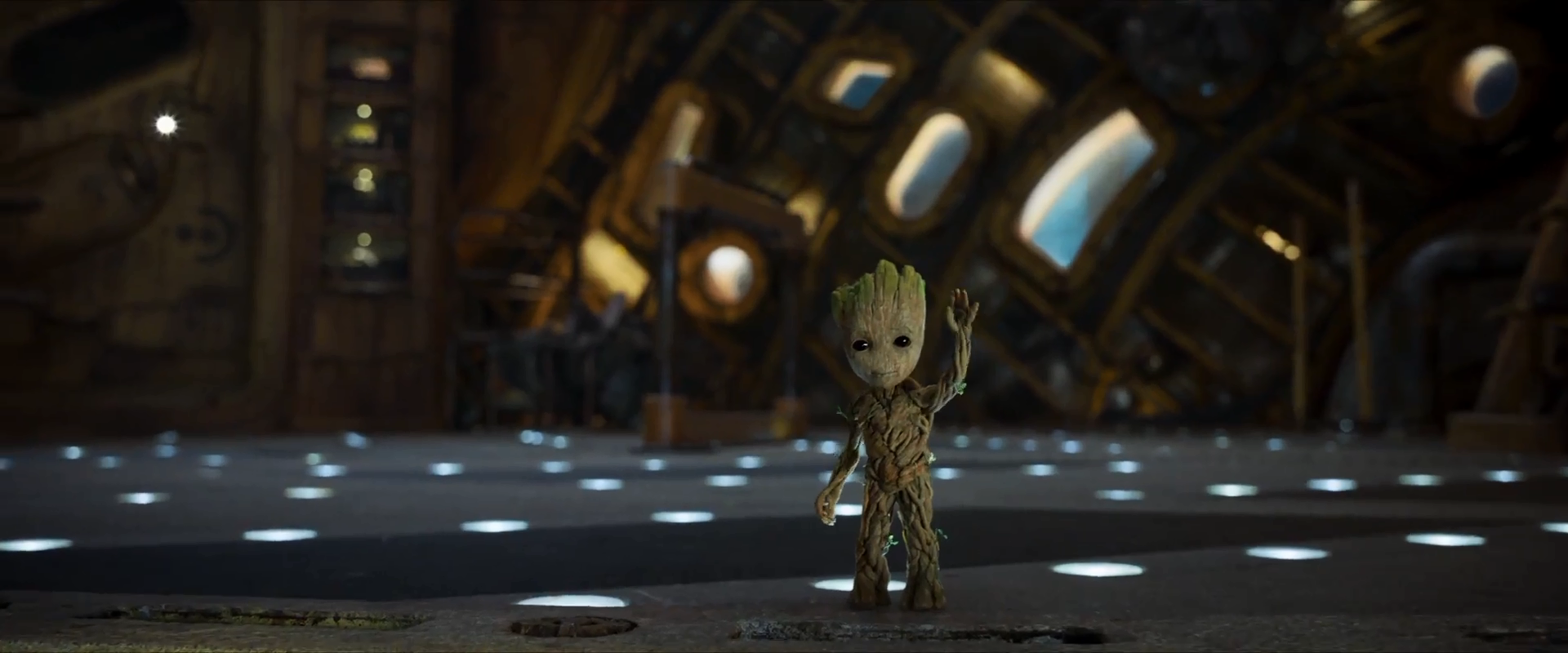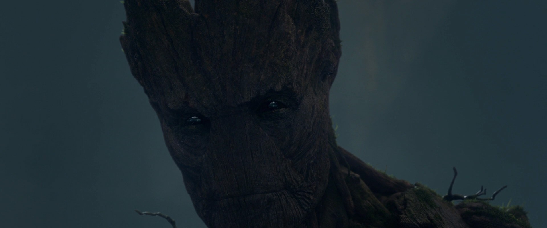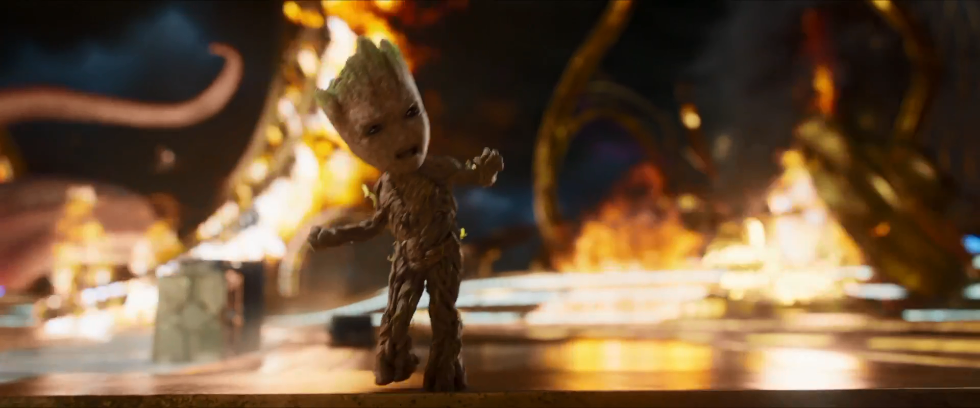 Despite that group was knocked back from the concussive waves, Ronan was determined to kill the Guardians only for Rocket Raccoon to flew the Milano through the Dark Aster, causing damages from the inside of the ship. Due to the badly damaged ship, Groot witnessed it being lit on fire and felt that the ship is falling down and heading towards the sky. While Rocket was seen by Star-Lord and was picked up to meet with rest of the team, Groot observes the ship's structure crumbling down and decided to save his allies from the wreckage by forming a large branch to protect them.
