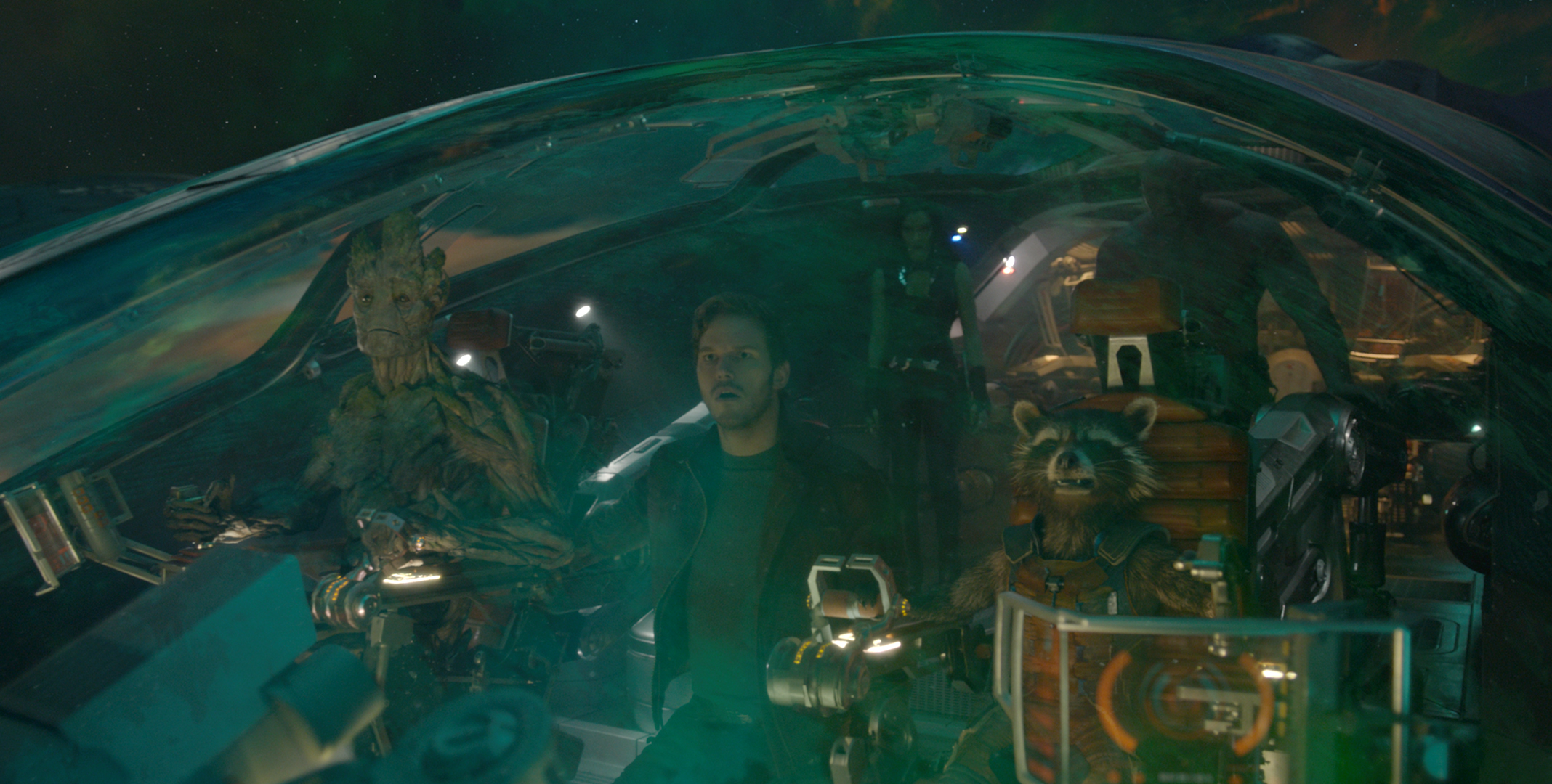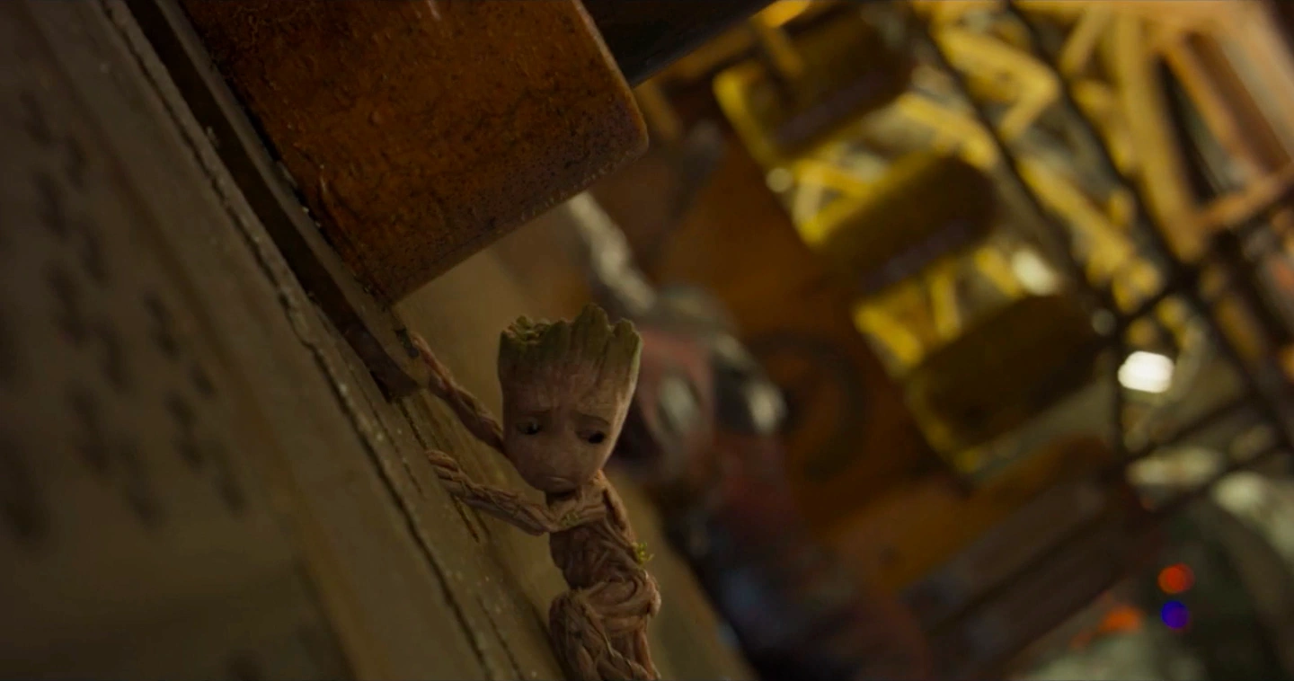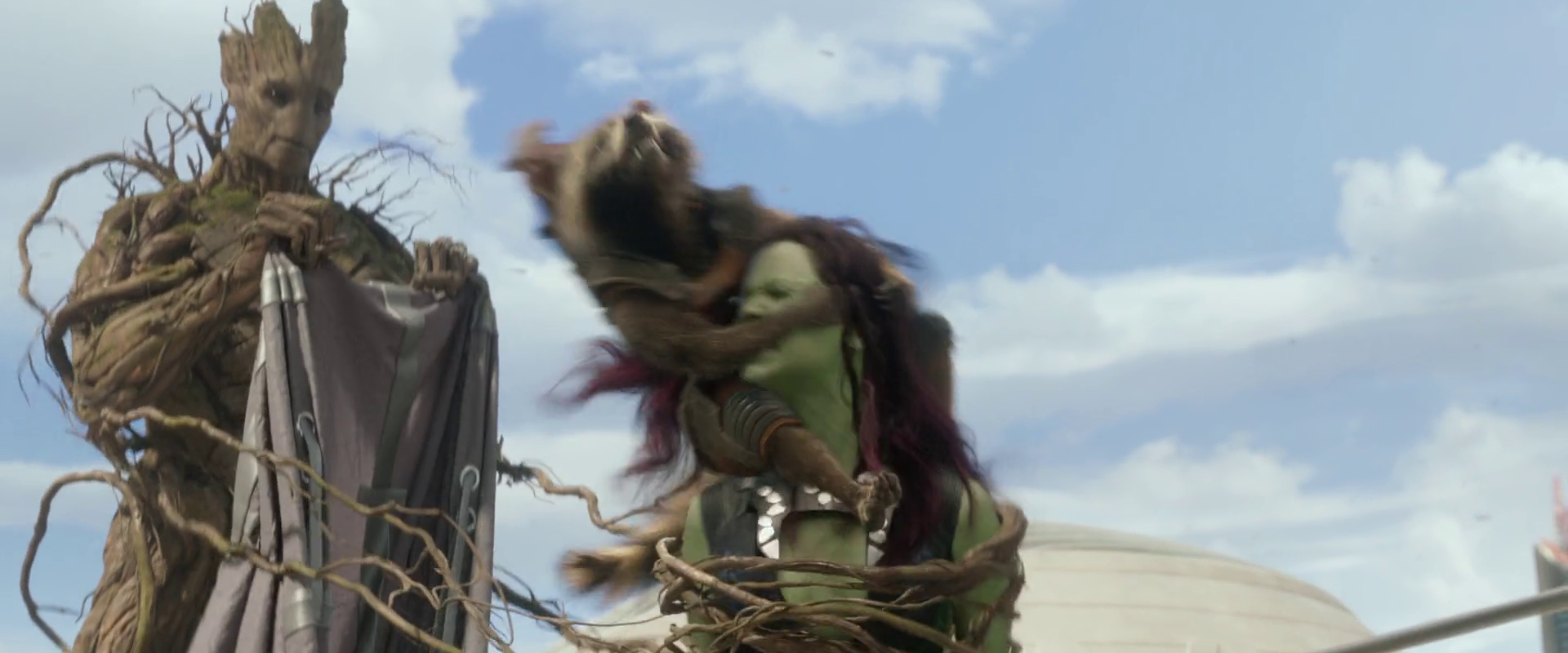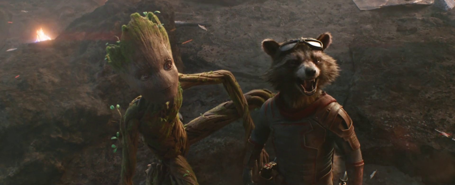 Despite that group was knocked back from the concussive waves, Ronan was determined to kill the Guardians only for Rocket Raccoon to flew the Milano through the Dark Aster, causing damages from the inside of the ship. Due to the badly damaged ship, Groot witnessed it being lit on fire and felt that the ship is falling down and heading towards the sky. While Rocket was seen by Star-Lord and was picked up to meet with rest of the team, Groot observes the ship's structure crumbling down and decided to save his allies from the wreckage by forming a large branch to protect them.
