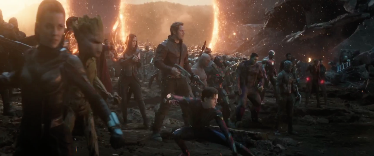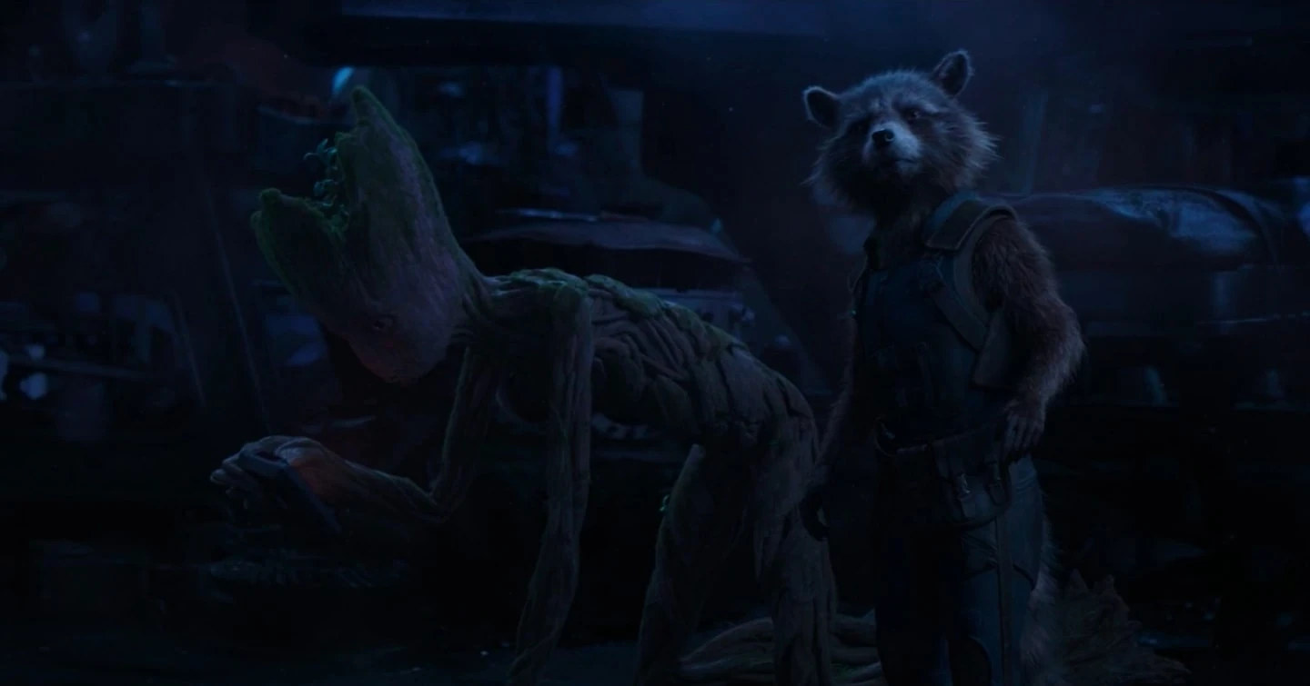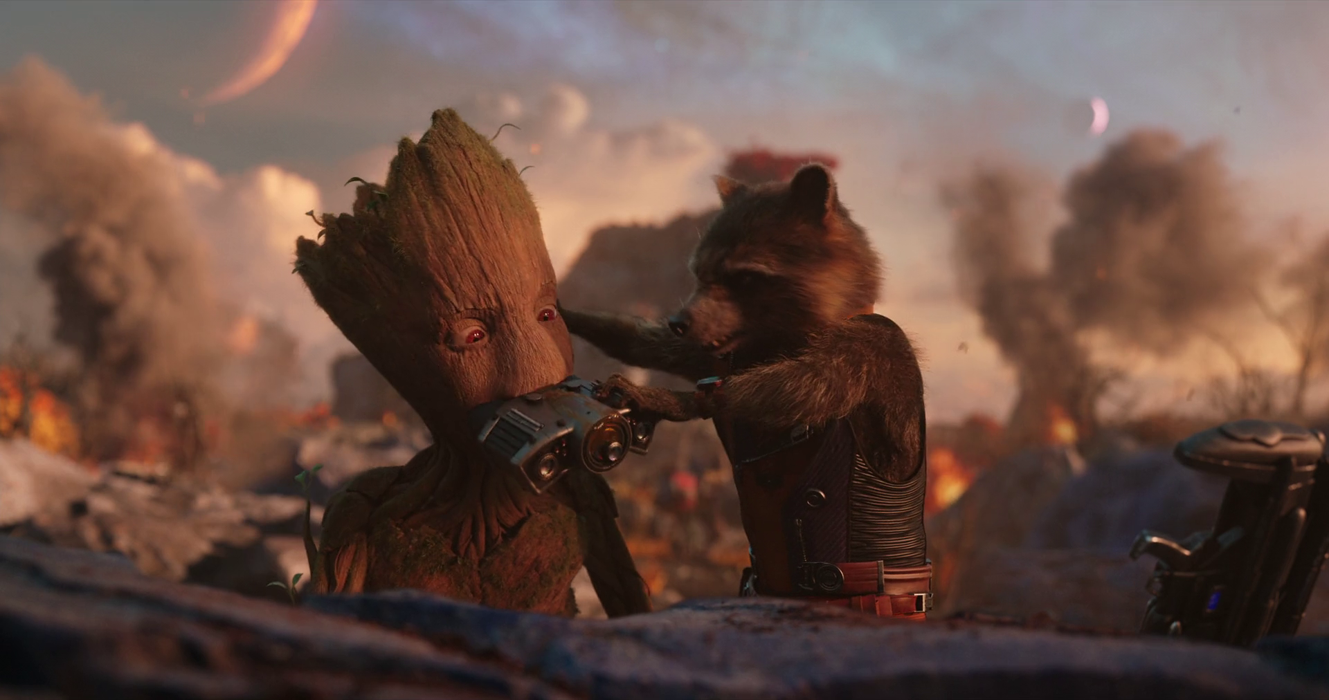Both Groot and Rocket then left the Guardians temporarily to accompany Thor to Nidavellir in order to help his mission to stop Thanos from completing the Infinity Gauntlet. After they had helped Thor obtain his weapon, Stormbreaker, Groot and Rocket traveled to Earth using the Bifrost Bridge and joined the Battle of Wakanda. Groot fought alongside Captain America and attempted to attack Thanos; however, when the Mad Titan amassed all six of the Infinity Stones, he succeeded in eliminating fifty percent of the universe's population, which resulted in Groot's death.