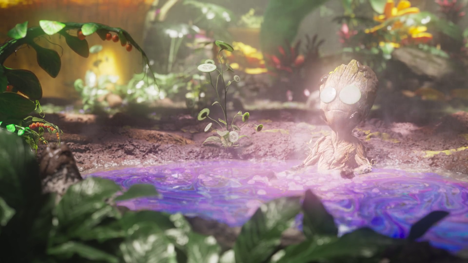 Sometime later, Groot and the Guardians traveled to Gangalor. Groot went exploring the planet by himself once again and found a puddle. He saw that the puddle was warm and held mud. He excitedly went in to take a bath. As he laid there, he found a bug and squeezed it to turn the puddle shiny. He also found a fruit to put over his eyes while he relaxed. He woke up to find that the mud caused him to grow leaves all over his body. He had trouble walking away and tripped.