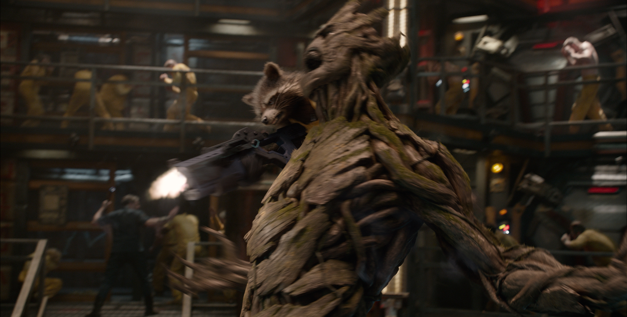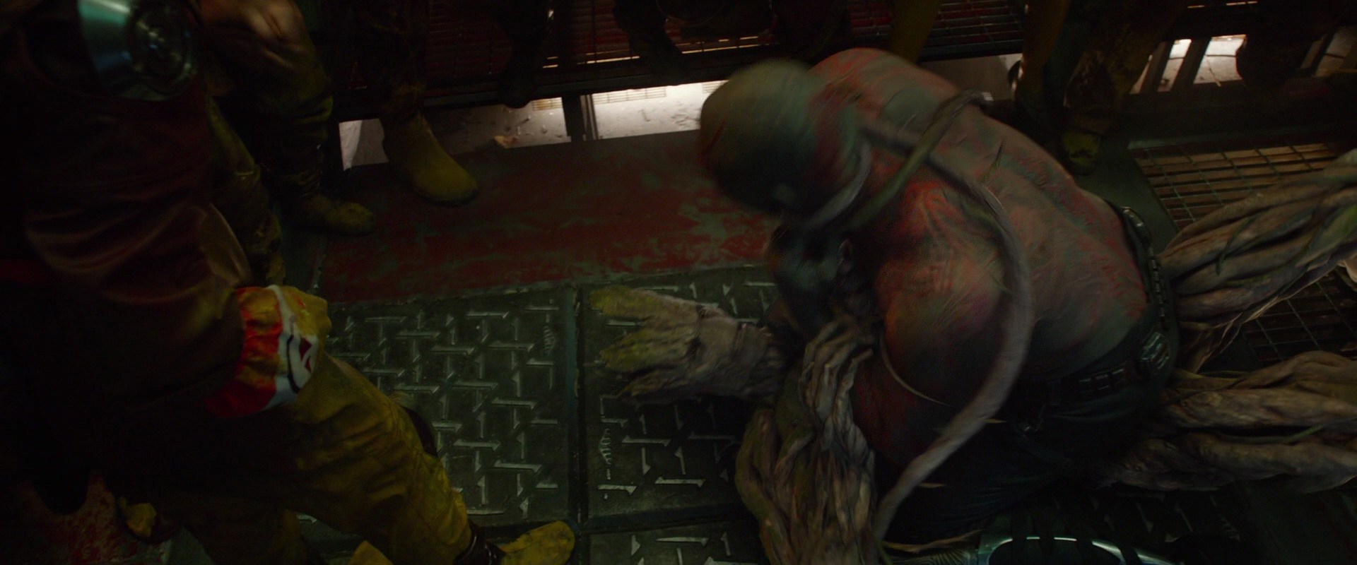 Once Drax came to their aid and tossed one of the guards' weapons, Groot became enraged and attacked the Kyln Hoverbots while Rocket began firing at them with great pleasure. Once Gamora gathered the green wiring that was required for the breakout, Rocket caught the item and told Groot move over to the watchtower. Ready for all of the others to regroup with him, Groot walked over to the railing where Gamora was and gave Rocket, Quill, and Drax help with climbing onto his roots in order to get into the security tower.