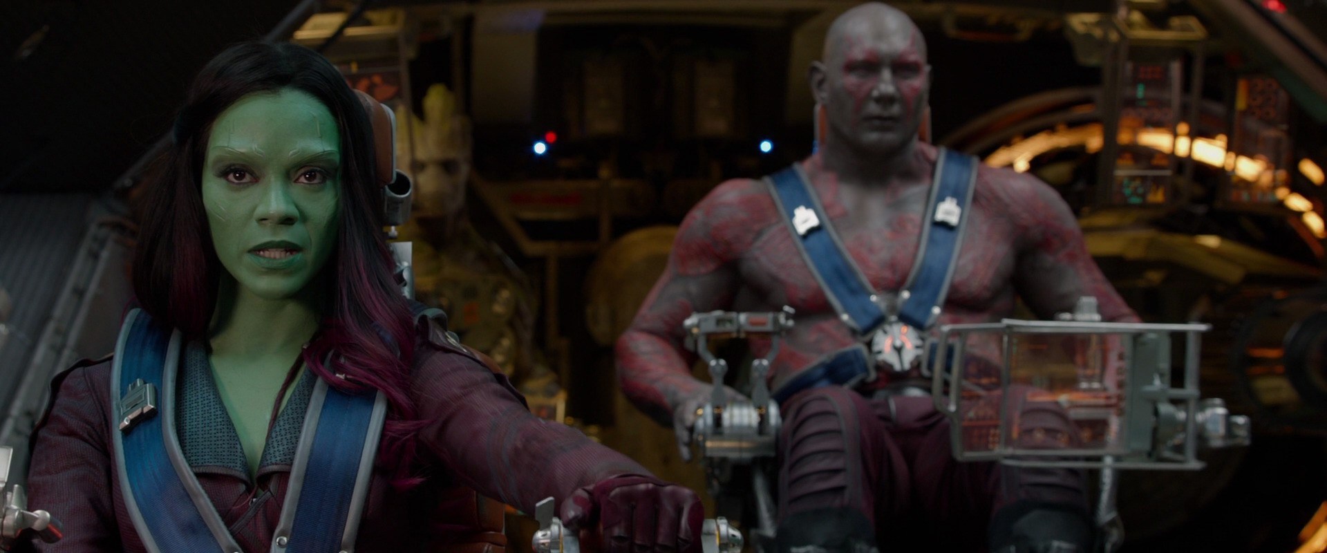 Once Drax had been easily subdued by Ronan and was thrown into a tank full of spinal fluid from the Celestial, Ronan and his army returned to a Necrocraft which took him back to the Dark Aster as Nebula had reclaimed the Orb from Gamora. Noticing Drax nearly drowned in the tank, Groot pulled him out just in time and resuscitated him by stabbing Drax in the chest. Rocket returned and told them that Quill and Gamora had been captured by the Ravagers.