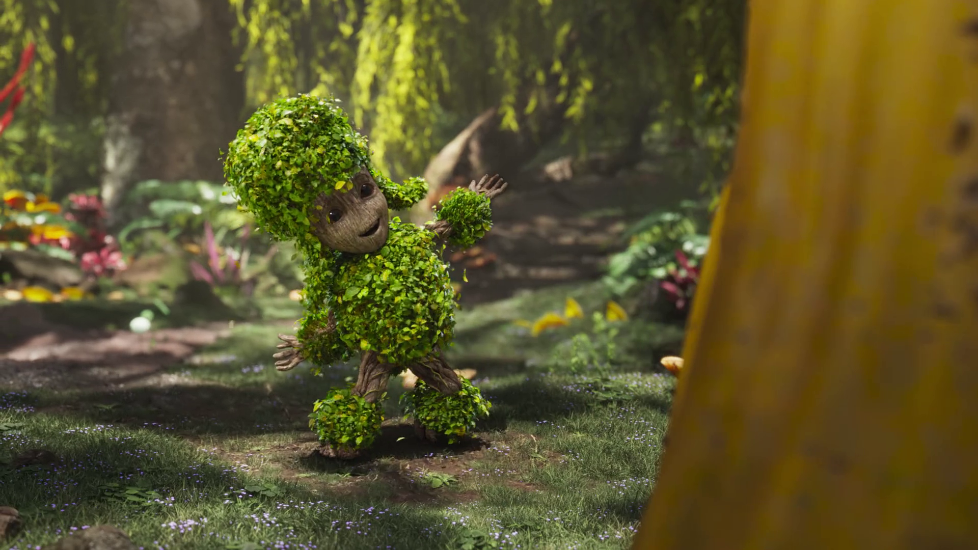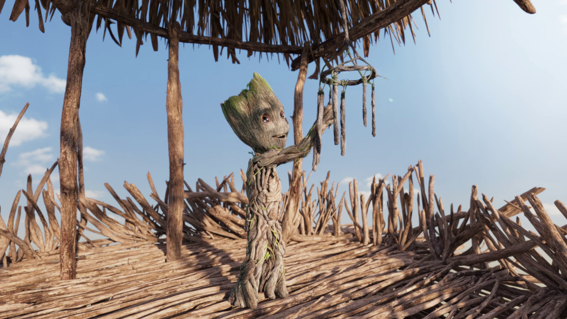 Groot sat in his pot on top of a table. Two machines came over to clean him up. However, they eventually brought over a new tree to replace Groot. He sat on his new table with a blanket around him to keep himself warm. The machines eventually took his blanket to put on the new tree prompting Groot to angrily kick a Yaro Root at the tree only for it to ricochet back at him. Groot was knocked off his table, but caught himself.