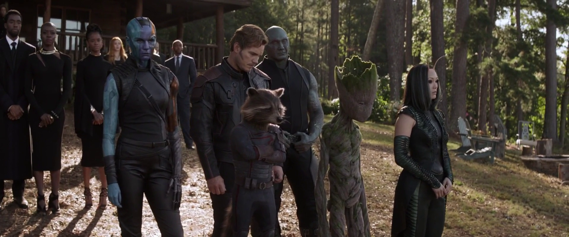 Groot and Rocket were then transported to Earth by Thor who used Stormbreaker to summon the Bifrost Bridge, and arrived in the middle of a battle in Wakanda.