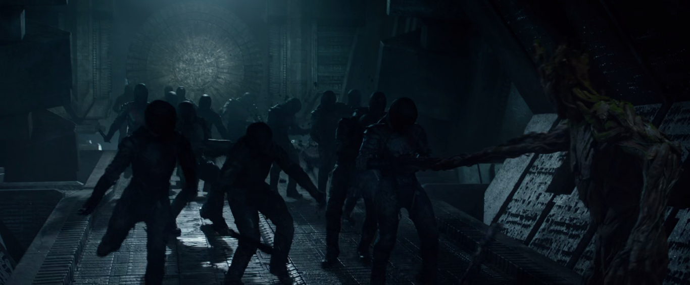 Once they landed and left the crashed ship, they discovered that the Dark Aster was too dark for them to see so Groot guided them through the darkness by creating bio-luminous spores to create a strange light across the ship to show them the way, when Drax questioned how he could do it, Star-Lord noted the answer would likely be "I am Groot." Suddenly, they were stopped by Nebula, as she cursed at Gamora for betraying Ronan and Thanos.