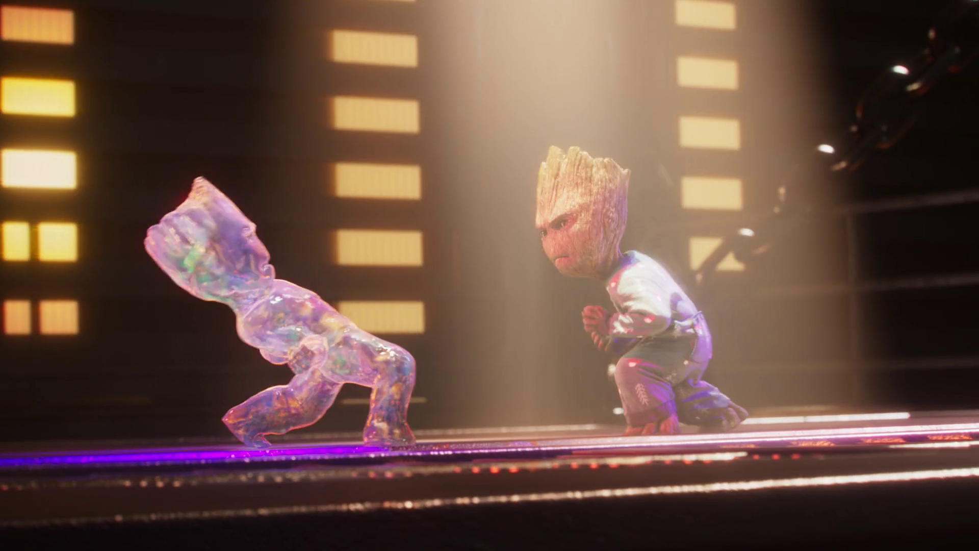 Groot glared at Iwua, stating he was Groot, in which Iwua copied his every move. Eventually, Groot thought it was fun and had a dance off with Iwua until the alien gave him tips on his dancing. During his examples, he shapeshifted back into his true form, an octopus-like creature. Groot realized that he was dangerous and danced with Iwua while leading him towards the escape hatch. Groot then pressed the button which sent Iwua into space. Groot then danced away as the hatch closed.[15]