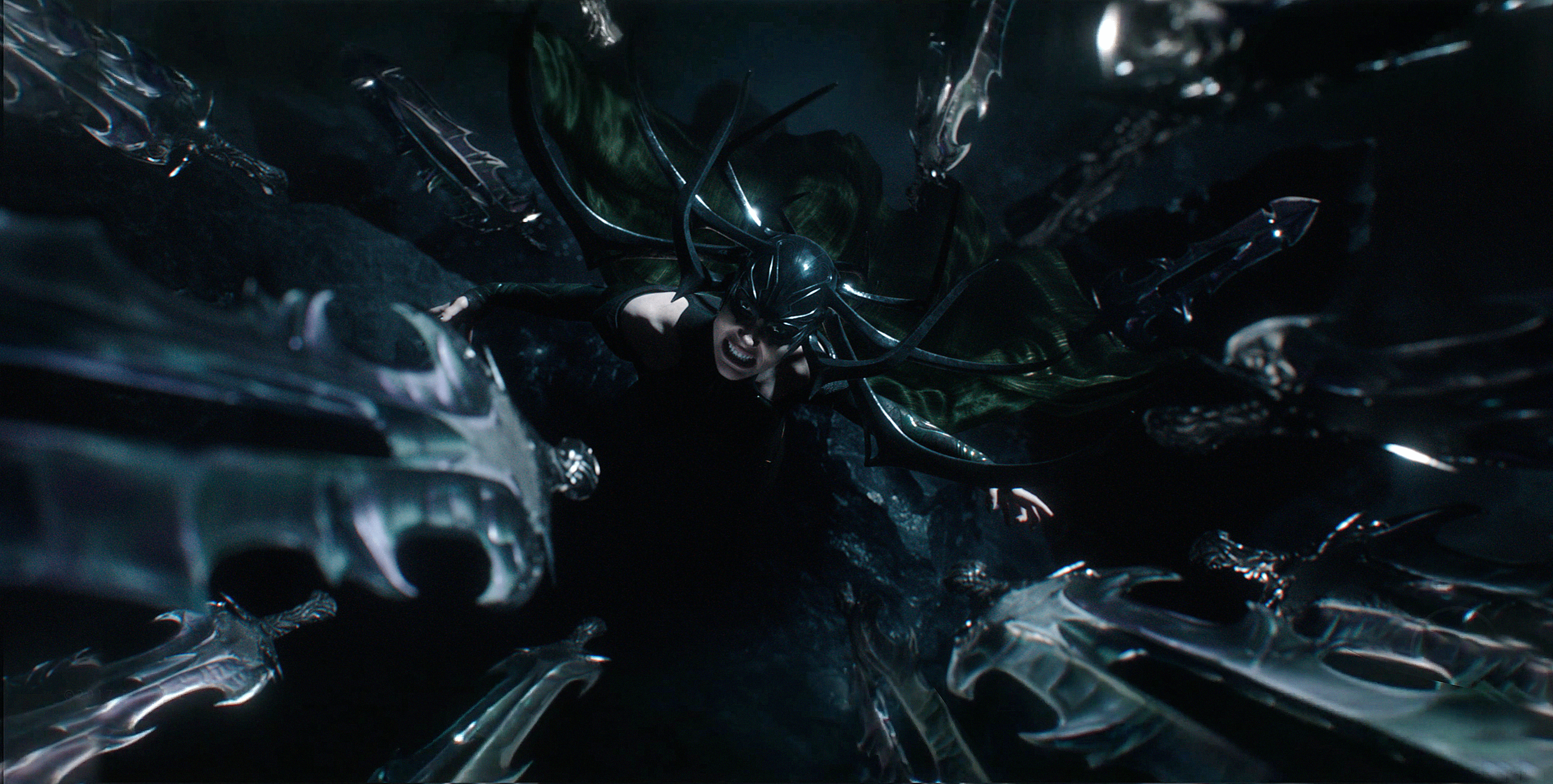Hela launching her swords at her enemies