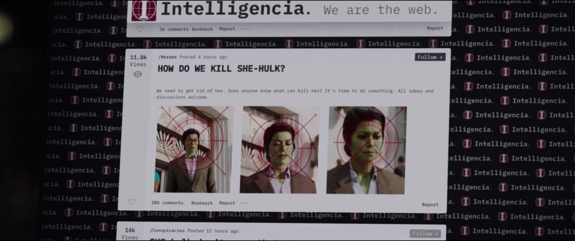 Additionally in 2025, a campaign to kill Jennifer Walters was posted on Intelligencia. The section dedicated to this was named the "Slutty She-Hulk" section. It included posts about cancelling She-Hulk, the double standards of her, how she was trying to erase the definition of men, and how she needed to die. Pictures of her were included, with some in meme formats and others with a red X targeting her.[2]