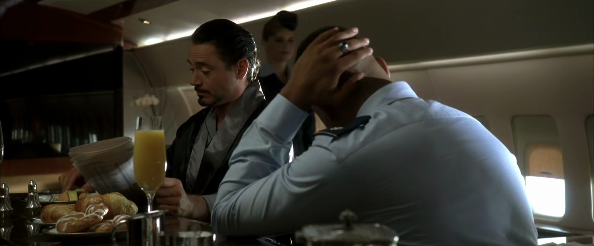 Getting to the plane, Stark watched as Hogan pulled in after. Stark claimed he believed he lost Hogan, which the latter confirmed he did and he had to take a shortcut. As they walked up to the plane, Rhodes started ripping into Stark for breaking the promise he made the night before. Stark thought nothing of it, saying he got stuck doing a piece for Vanity Fair. Rhodes was left speechless. The plane lifted off as a stewardess helped Stark with refreshments.