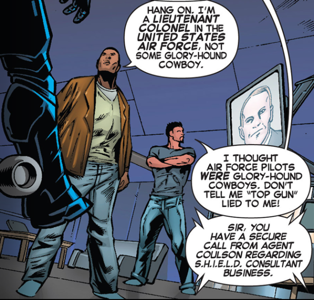 Stark went to meet with Rhodes who was giving a speech to new members of the United States Air Force. Stark interrupted the talk and teased his friend who then ordered the men to leave them in peace. When Rhodes questioned what Stark was doing there, he was told that Stark was working on a big new project, which seemed to delight him until Stark revealed it was not military. Rhodes then recommended that Stark get his mind straight instead.[3]