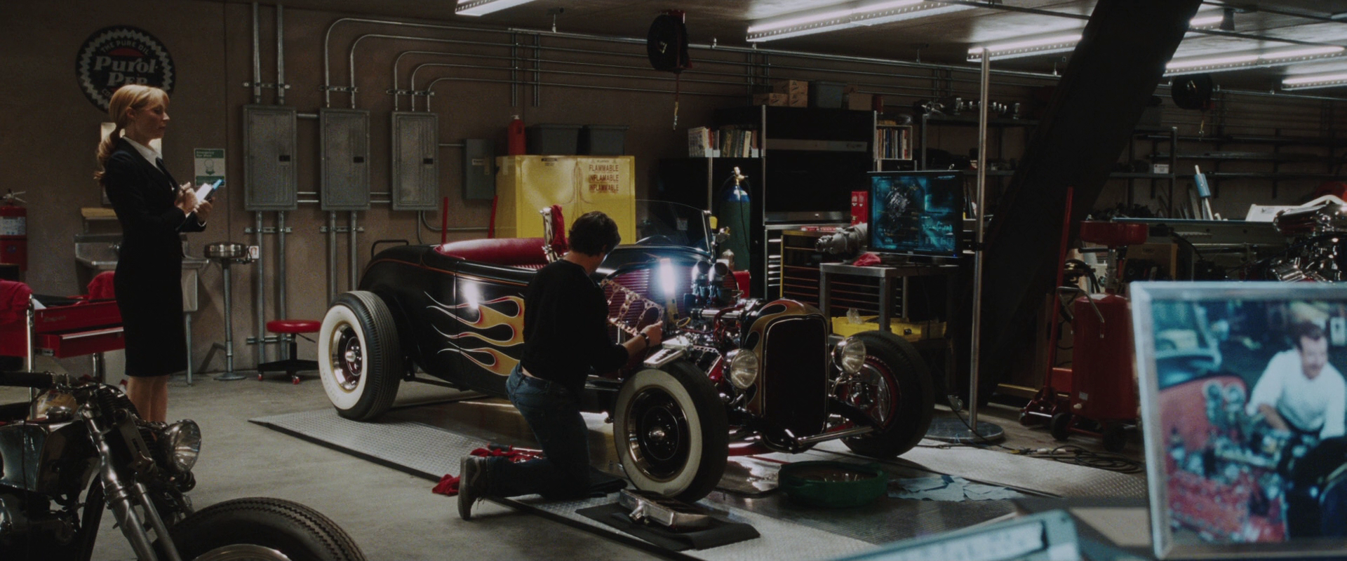 In the morning, Stark woke up early, apathetic in his agreement to meet with James Rhodes at Stark Industries Aviation Division. Instead, he left Christine Everhart in bed and went to his garage to work on his Ford Flathead Roadster. Taking apart the engine, Stark asked J.A.R.V.I.S. to give him an expanded view of the inside and was told that the compression in cylinder three was low. Stark made sure that J.A.R.V.I.S. logged that note.