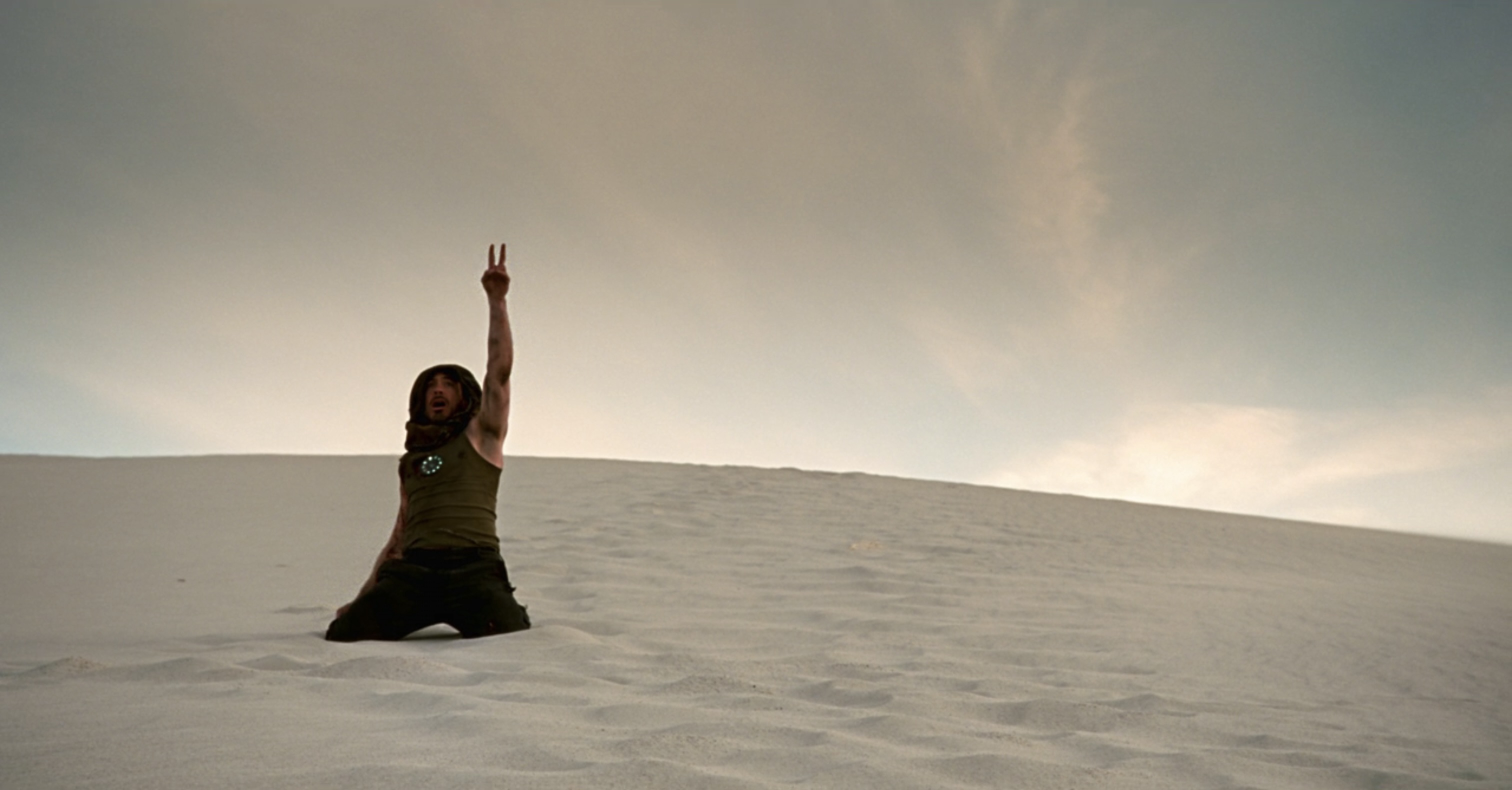 Stark began making his way through the desert, using his jacket to protect himself from the intense heat until finally, a United States Air Force helicopter flew overhead. Stark yelled out for help and collapsed to his knees, wearily making a peace symbol in the air. James Rhodes then rushed out of the helicopter with the military and the two friends embraced each other. Rhodes urged Stark to ride with him next time before taking him to safety. Upon being picked up by the Air Force, Stark was then finally returned to the United States of America at long last.[3]