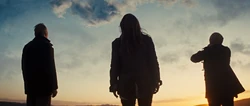 Foster watched as Thor attempted to apologisze to his brother, but it did not work, and the Destroyer strikes Thor, sending him flying back. Foster quickly ran to Thor's side to check on him, and he told her that she was now safe as he died from his injury, to the sadness of Foster. As Foster wept over Thor's body, Mjølnir began to launch from the desert and fly towards them, so Erik Selvig grabbed her and got her to safety.