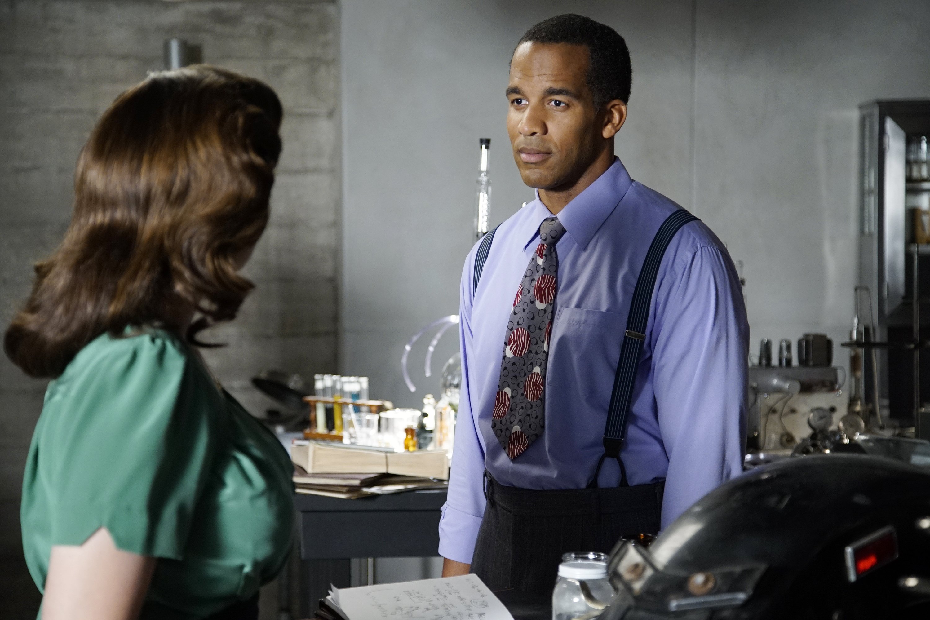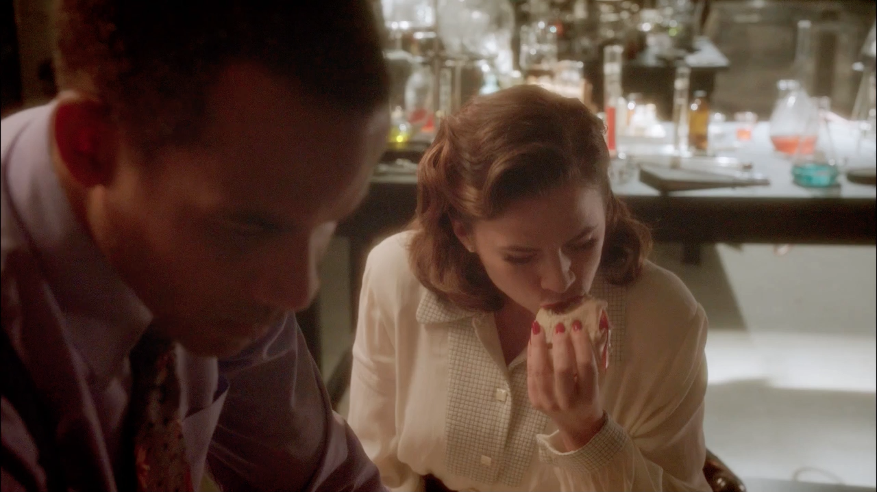 Later, that afternoon, Wilkes saw Peggy Carter and Daniel Sousa talking to the Receptionist; Carter approached Wilkes and asked him why the building was closed and if the containment leak story was true. Looking toward the Receptionist, Wilkes hesitantly confirmed her story. While speaking, Wilkes wrote a note to Carter to meet him at the Dunbar Hotel for the truth; Carter warned him not to get entangled with the schemes of Isodyne Energy. Wilkes proceeded into the laboratory and stole a film reel; he did not know he was being watched.