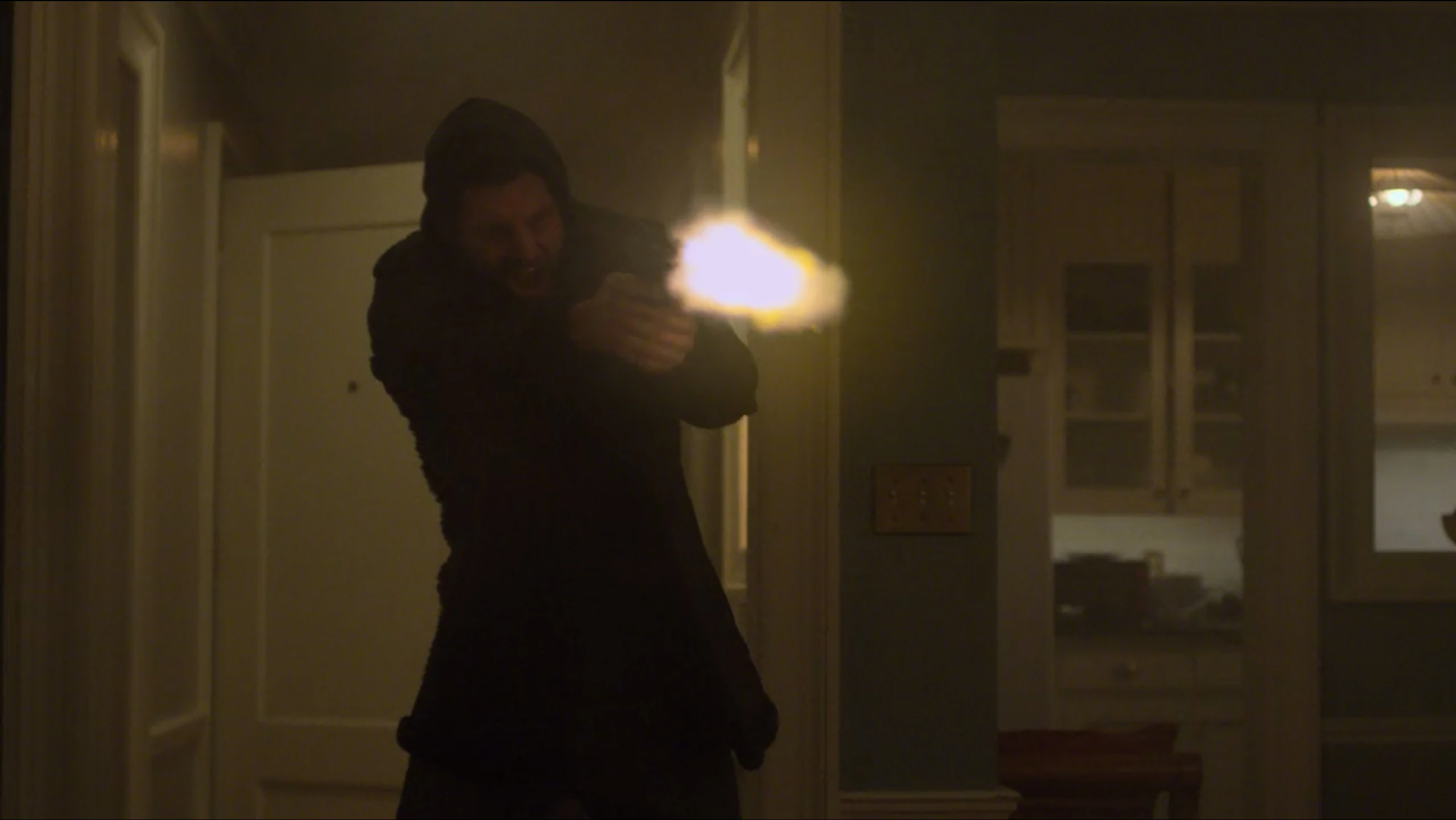Enraged by what happened to Dumont, Russo charged upstairs and towards her apartment where Madani currently was, before shooting wildly through the walls at Madani, who in return fired back through the walls. Confirming where Madani was in the apartment, Russo had smashed through the door and began shooting at his former lover, screaming out loud as he did so while Madani dived behind the sofa for cover. Having emptied his entire magazine at Madani without ever hitting her, Russo had attempted to reload, only for Madani to get out from her cover and fire two bullets, hitting Russo in the stomach.
