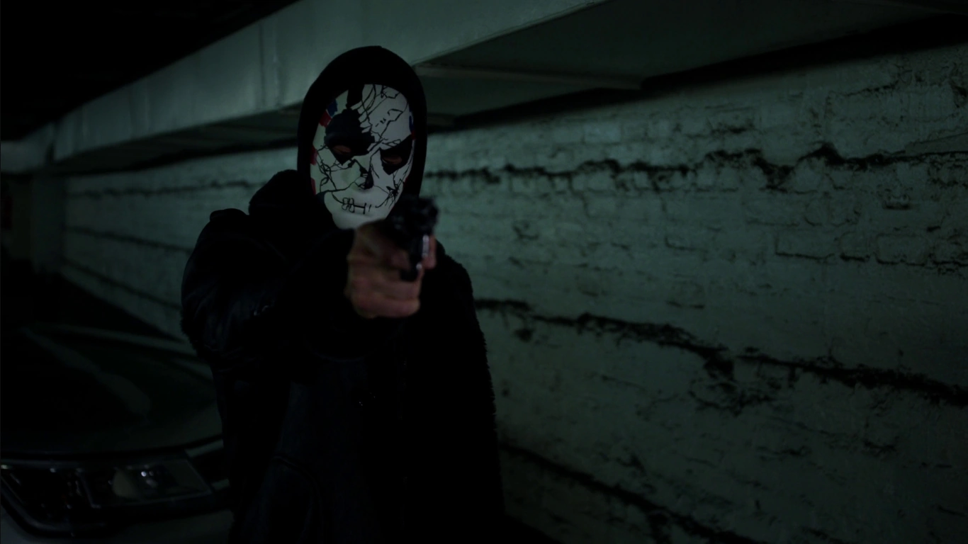 Tracking a laser pointer which he had believed Castle had taken over, Russo waited until it was still and fired upon it, only to discover that Castle had in fact left it on the desk in order to trick Russo. As Russo scanned the room to find his target, Castle had managed to get the drop on Russo; however, and they then both shot and mildly wounded each other. When Castle told Russo, who he did not recognize due to the mask, to stay down, Russo ignored him and chased after him as Castle then jumped through the window and ran to safety on foot, as Russo continuing to fire after him despite just missing his shots.