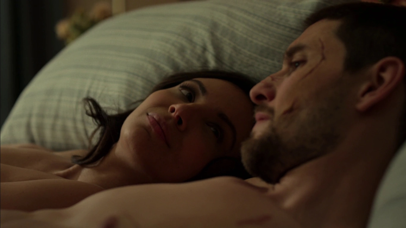 Russo returned into the Madani Residence where Russo and Dinah Madani had sex in her shower. Once finished, Russo lay naked with only a towel in Madani's bed while watching her put on clothes ready to return to work at Homeland Security. As she looked at his body, Madani questioned where some of Russo's bruises came from, with Russo lying about the recent shootout which caused it and claiming that they had come from a paintball during his training.