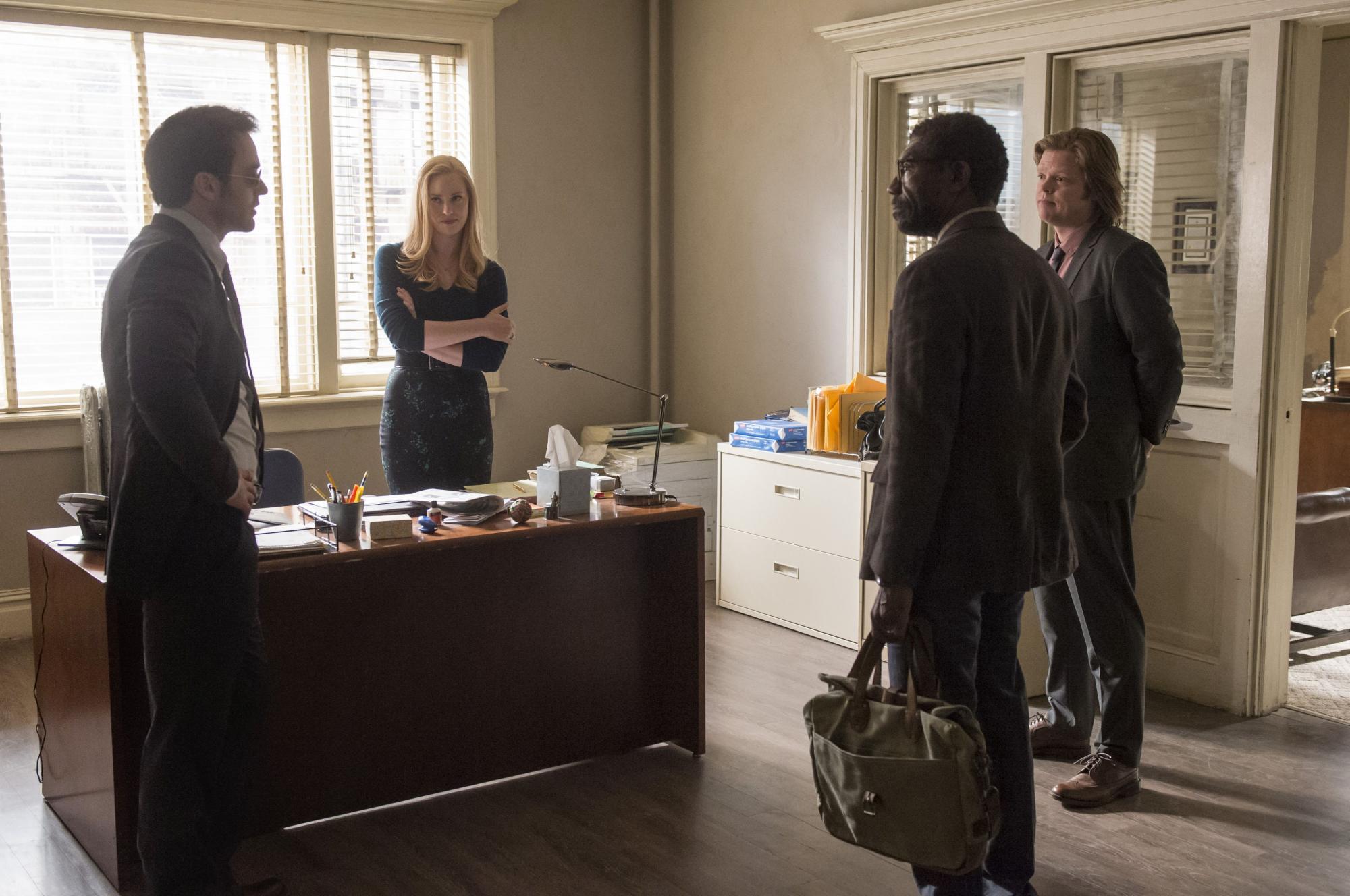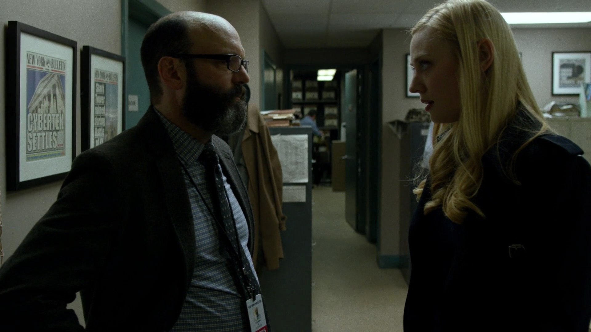 A knock on the door was heard; Page was so surprised that Murdock had to remind her that it was her job to answer it. She welcomed a well suited man who would not give his name. He revealed that he worked for a conglomerate that wanted to hire the lawyers to represent their client, John Healy, who had been accused of murder. Murdock was suspicious of the man and told him that they wanted a certain type of clientele; the suited man asked if all his clients worked for them after escaping murder charges. Knowing he was referring to her, Page felt embarrassed; she was asked to leave the meeting so the men could talk more candidly.