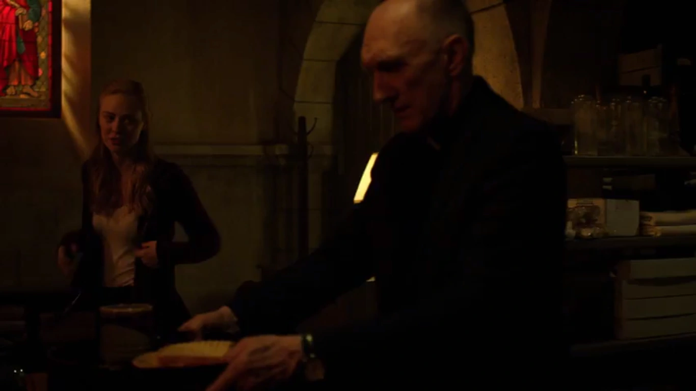 Page set up in the basement of the church and hid when she heard footsteps. When she found it was Father Paul Lantom, she came out. He offered to have her come upstairs for Mass, but she did not want to. Lantom gave her a talk about her troubled soul and even figured out that she had a troubled past. Page asked what to do when you realized you lost. Lantom brought up how Murdock went to see him after finding out about Grace. Murdock blamed Lantom for lying to him and Lantom understood and had to find a way to live with it. He told her that she should go to mass before leaving.