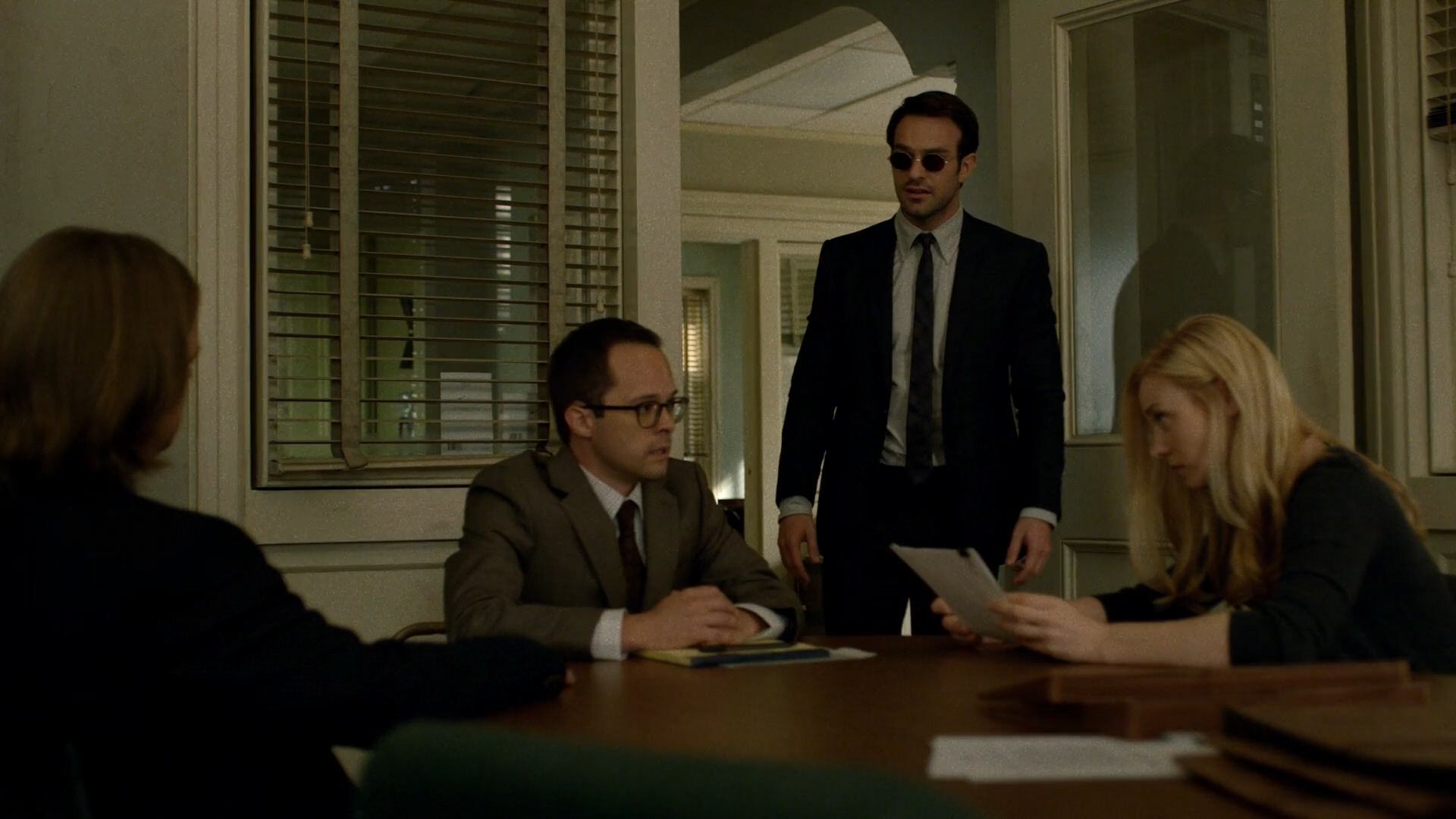 Page claimed that Daredevil does not kill people, so it is not Daredevil. She asked if Nadeem ever got to the leads she gave him and he admitted that it was on his to-do list. He brought up that Page was the only person that he did not lay a finger on, which was suspicious despite Page claiming that she did not have anything to do with it. Nadeem asked where Matt Murdock was and Nelson brought up that it had nothing to do with the conversation. Nadeem further talked saying Murdock was supposed to be there, but was not. There were zero Murdock's in his custody. Page spoke up saying there were also zero Jasper Evans' alive. She brought up that "Daredevil" killed the one guy that had dirt on Wilson Fisk. She went further saying the man did Nadeem a favor because Evans was the one person who could prove that Fisk was making a fool of the FBI.