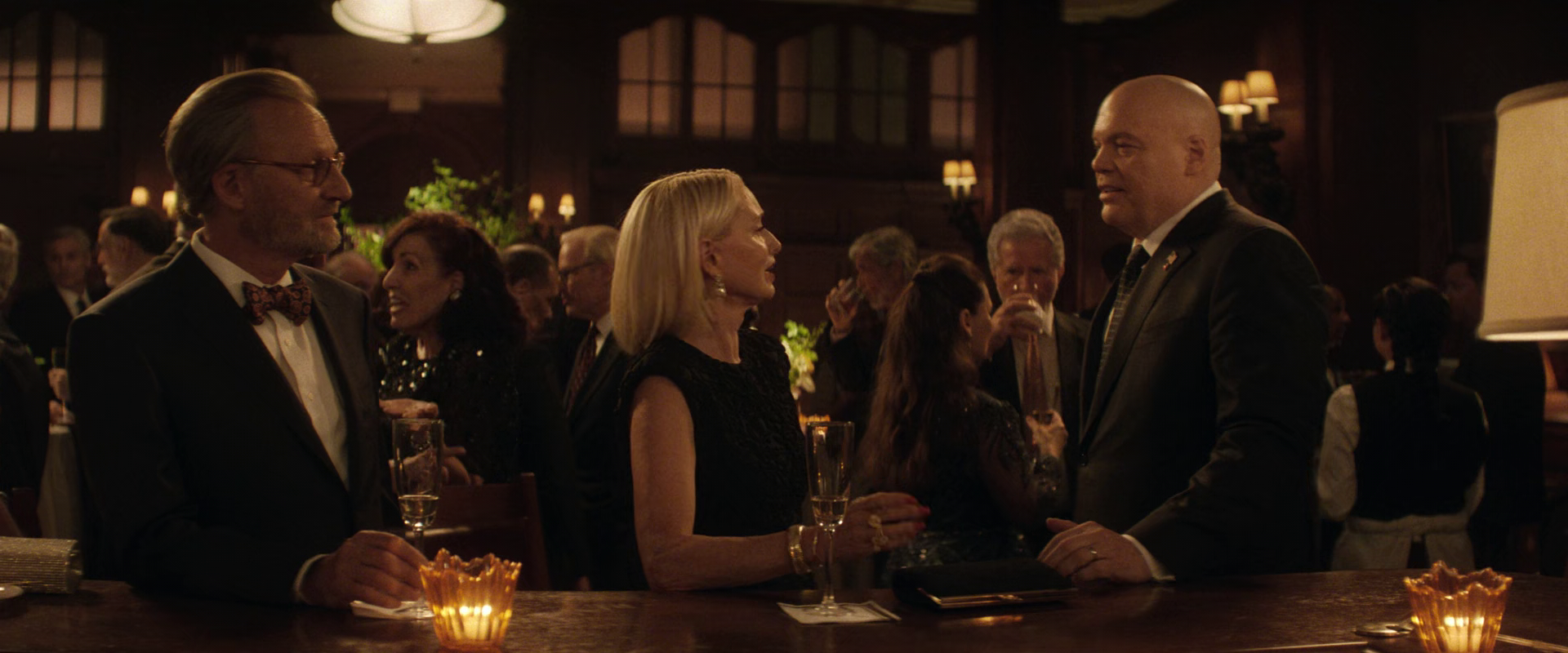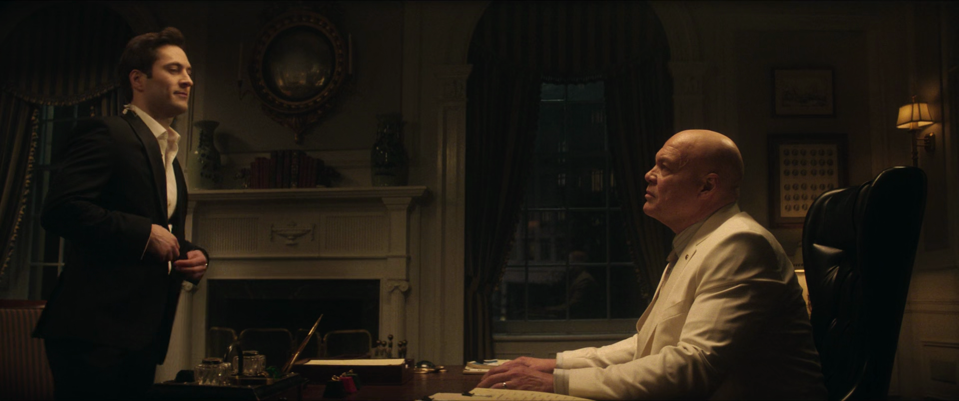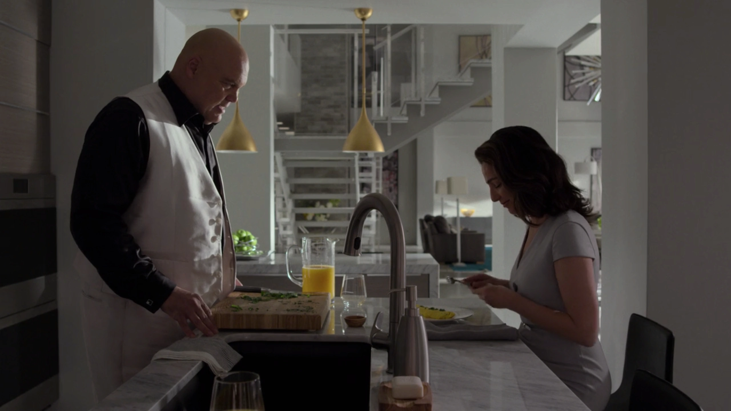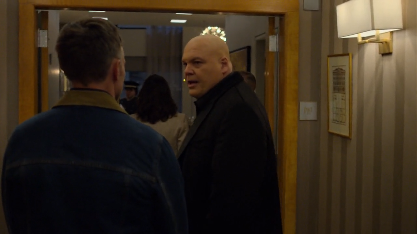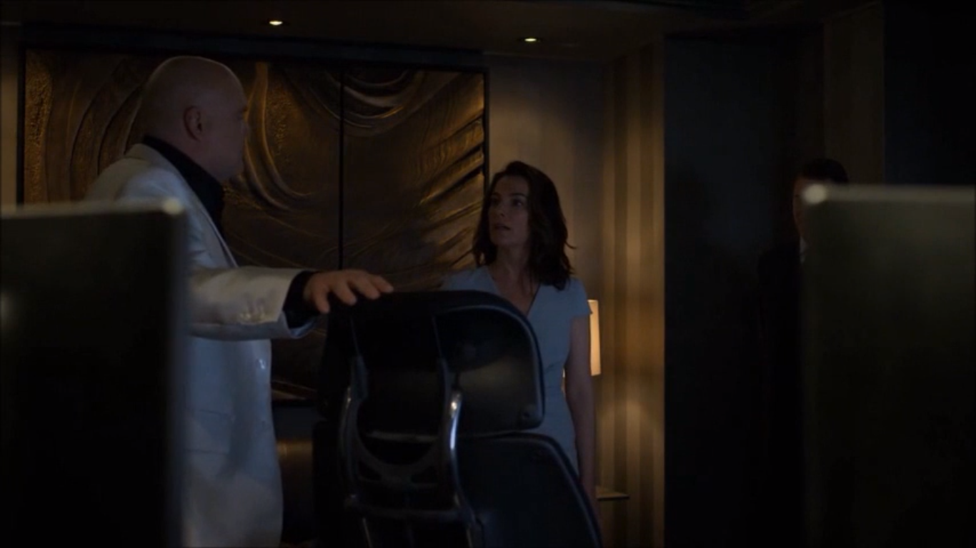 Despite them all sharing the laugh together, Murdock, however, then reminded Fisk that they should not be seen to be talking together as they were both currently on opposing sides of a law case. Fisk then explained to Marianna about how he had just recently bought all of the apartment properties from Armand Tully which was where Elena Cardenas was living, before he had then began to explain his plans on improving New York City but Marianna stopped him, noting that Murdock was a customer of the gallery who was just looking to buy some artworks and was not a donor for his political campaign.