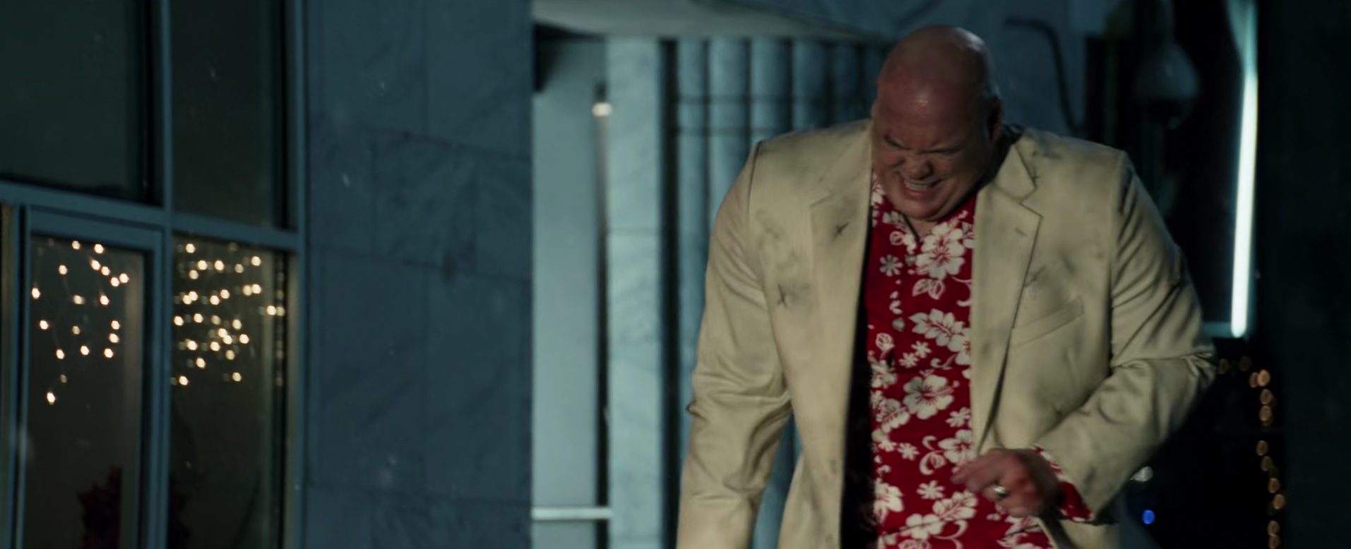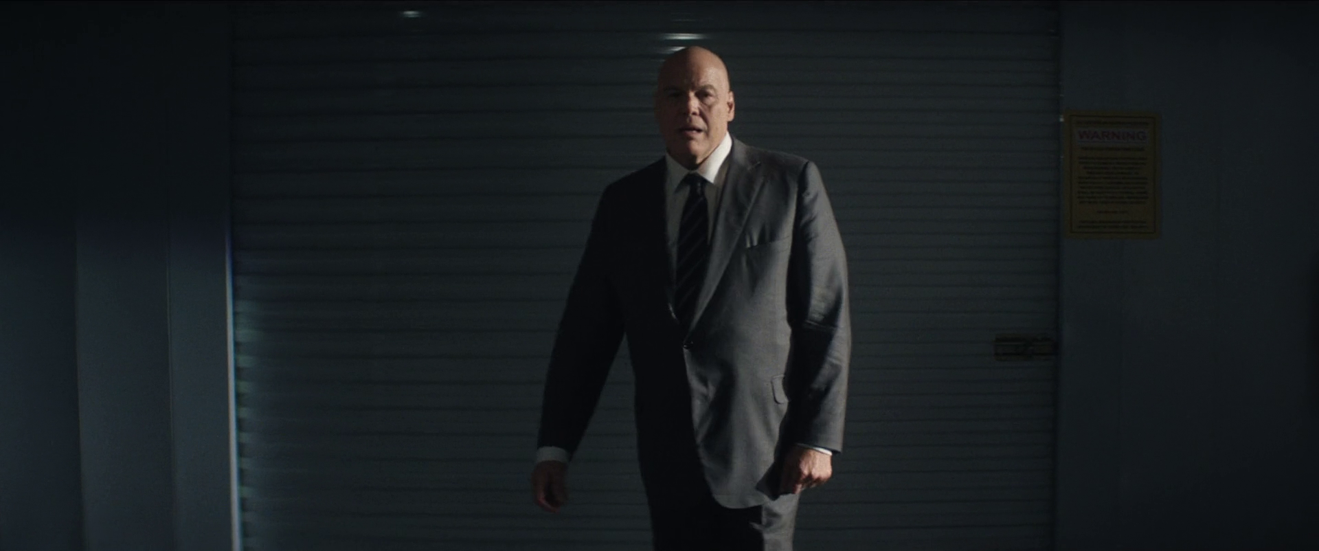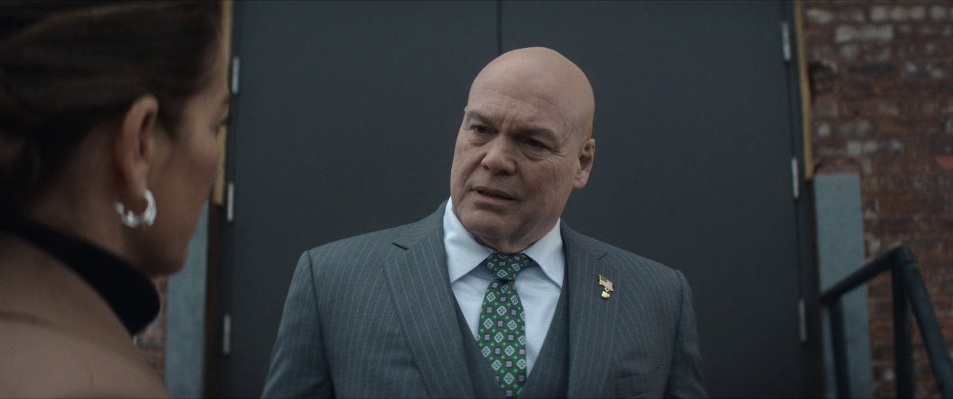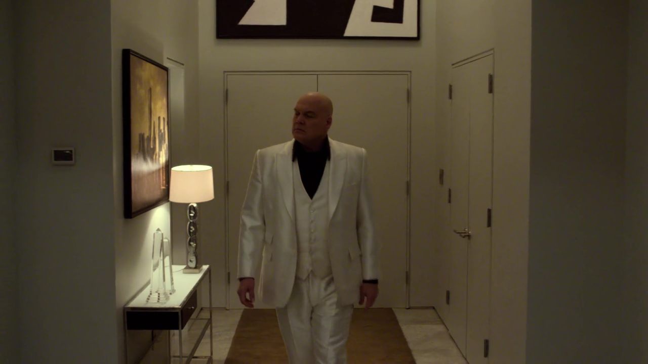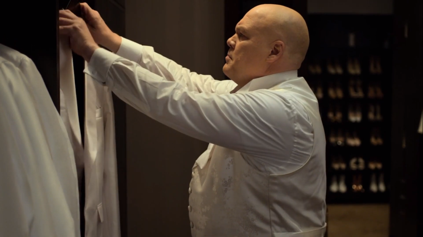 Hawkeye Costume Designer Michael Crow revealed that it was intended to move Kingpin away from his "polished look" in Daredevil as Vincent D'Onofrio wanted him to look "a little more down and out and grittier than he had previously been [in Daredevil],"[65] as "[Kingpin] has lost the power that he had [once] in Daredevil."[66]