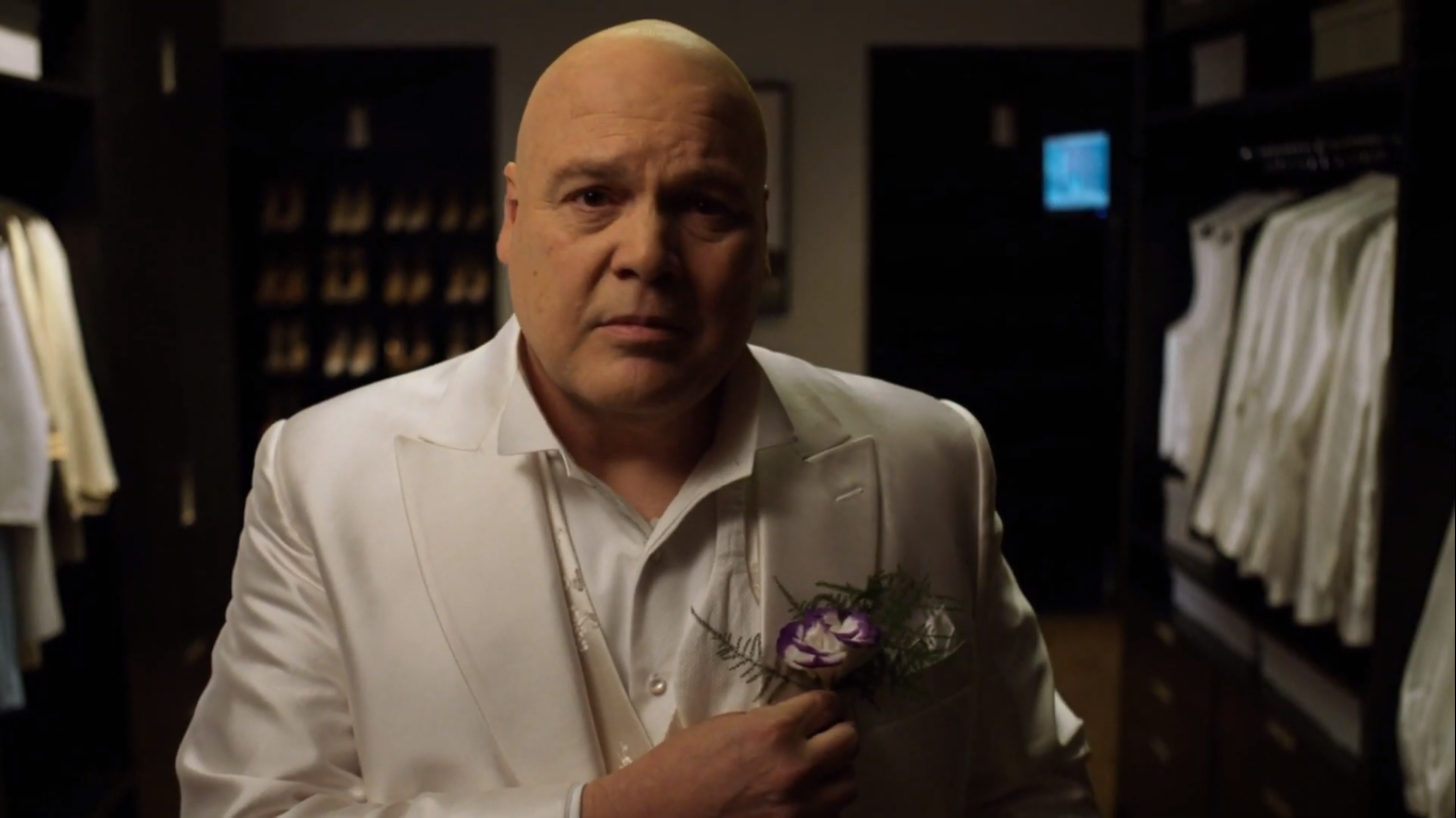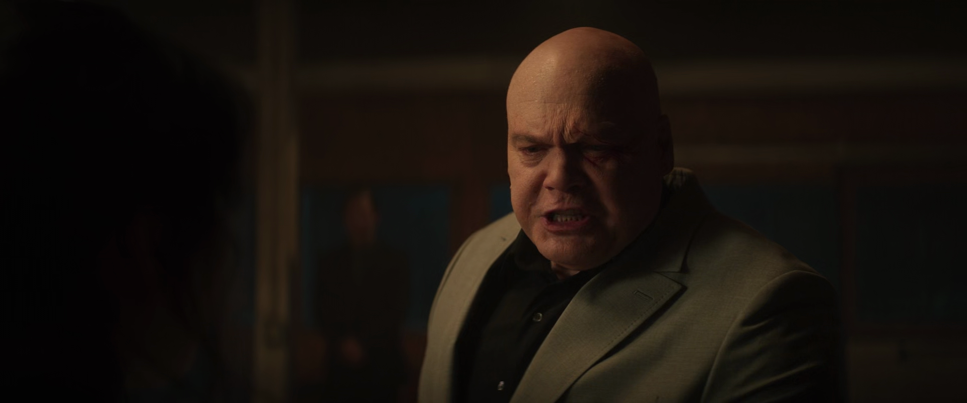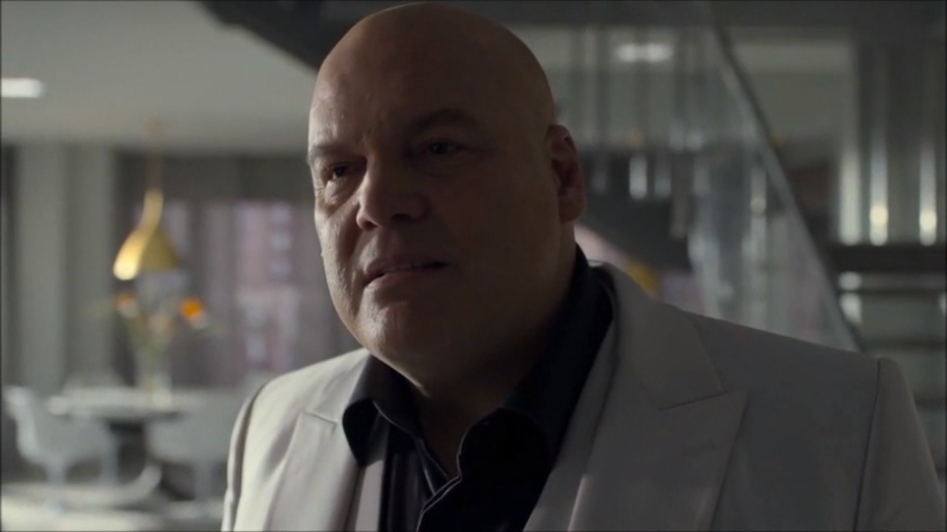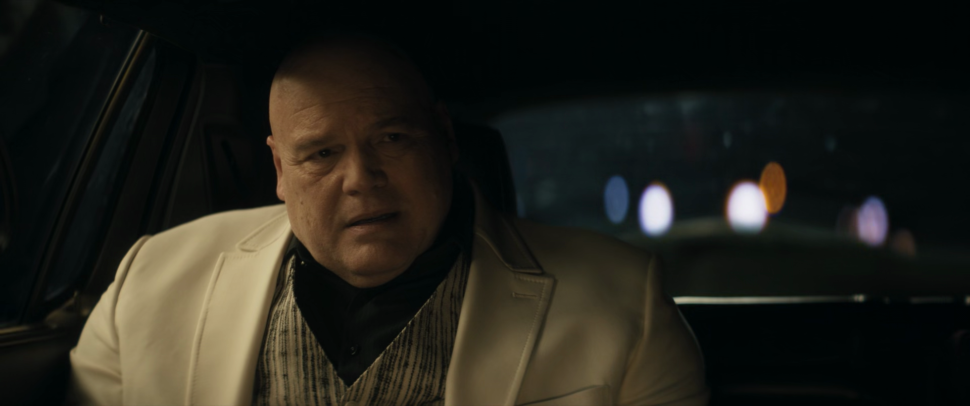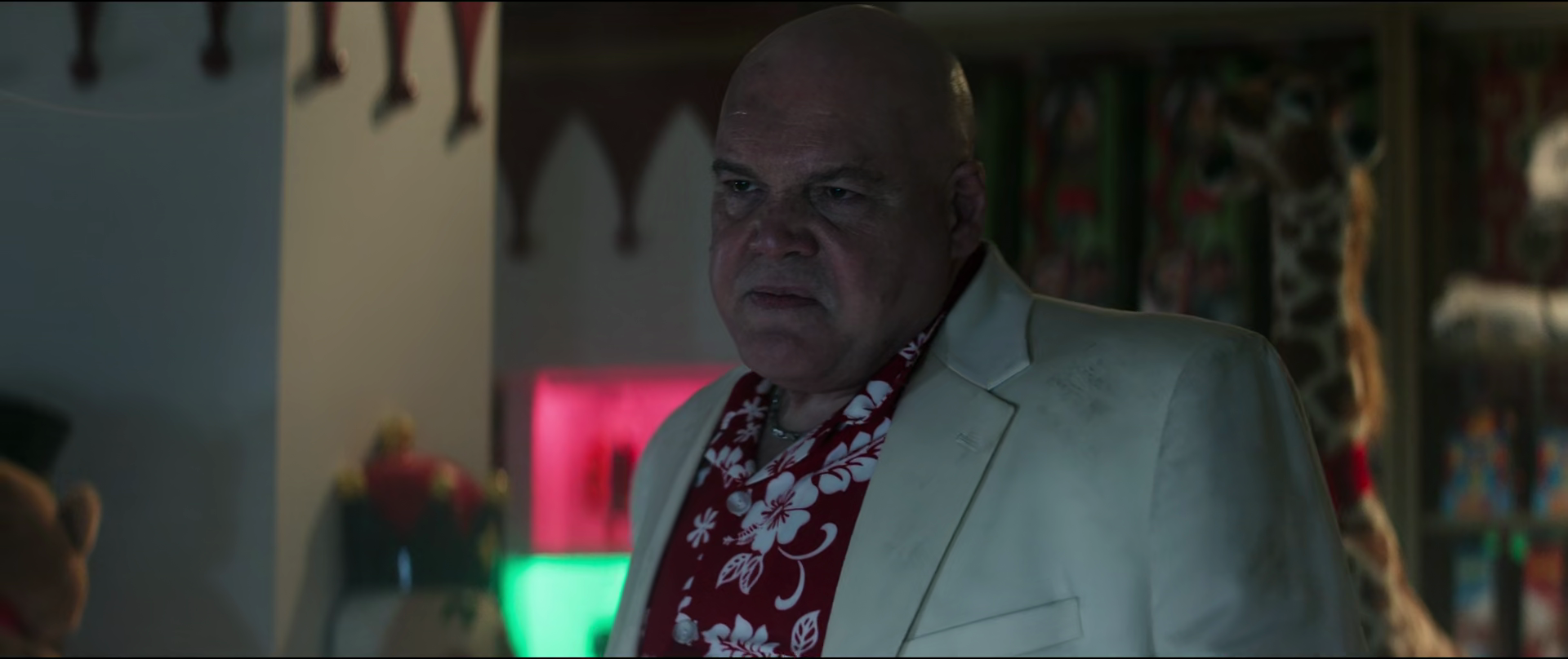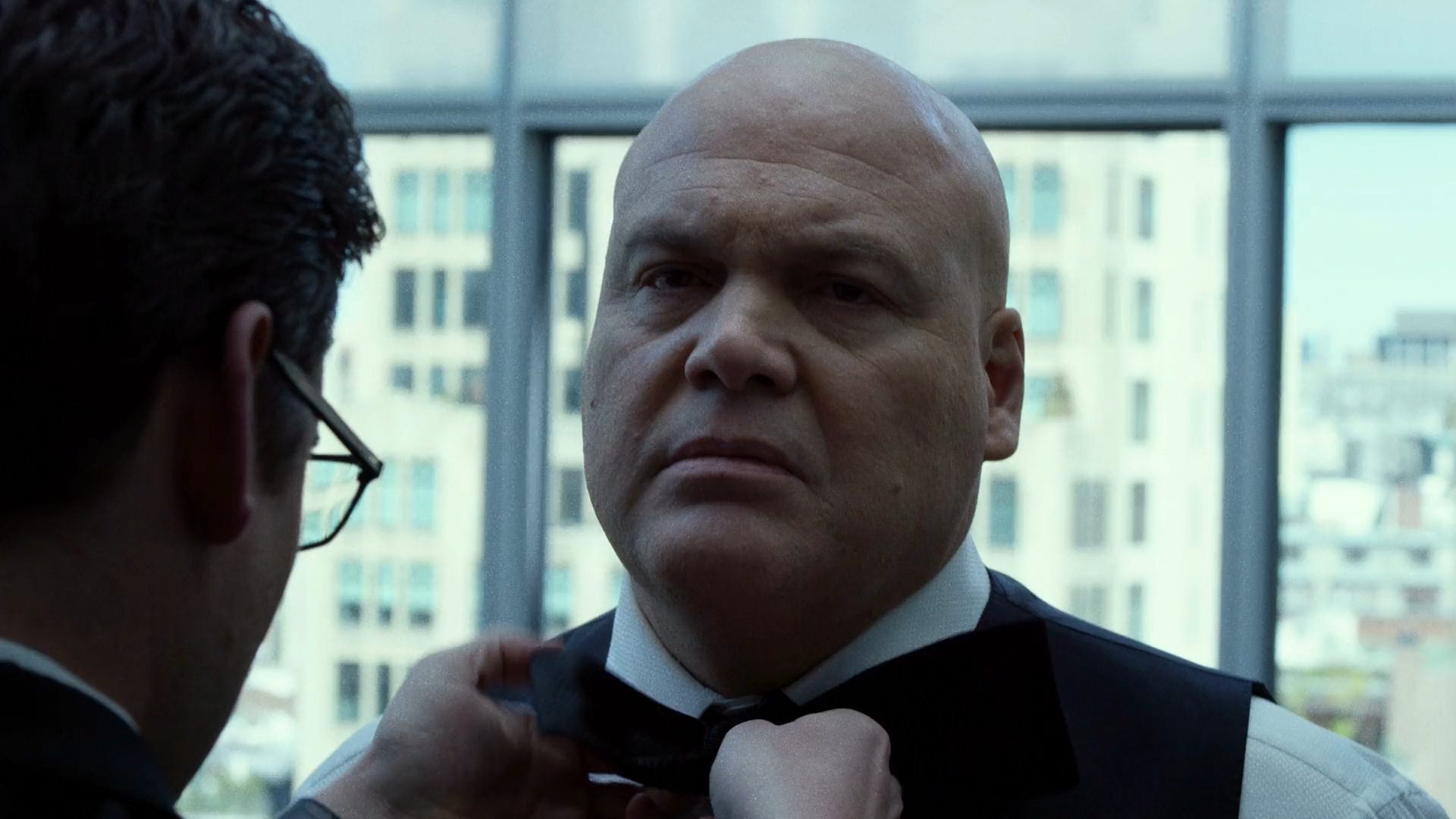 Hawkeye Costume Designer Michael Crow revealed that it was intended to move Kingpin away from his "polished look" in Daredevil as Vincent D'Onofrio wanted him to look "a little more down and out and grittier than he had previously been [in Daredevil],"[65] as "[Kingpin] has lost the power that he had [once] in Daredevil."[66]