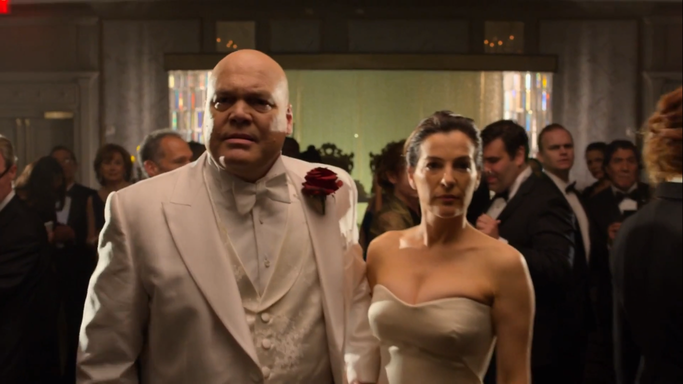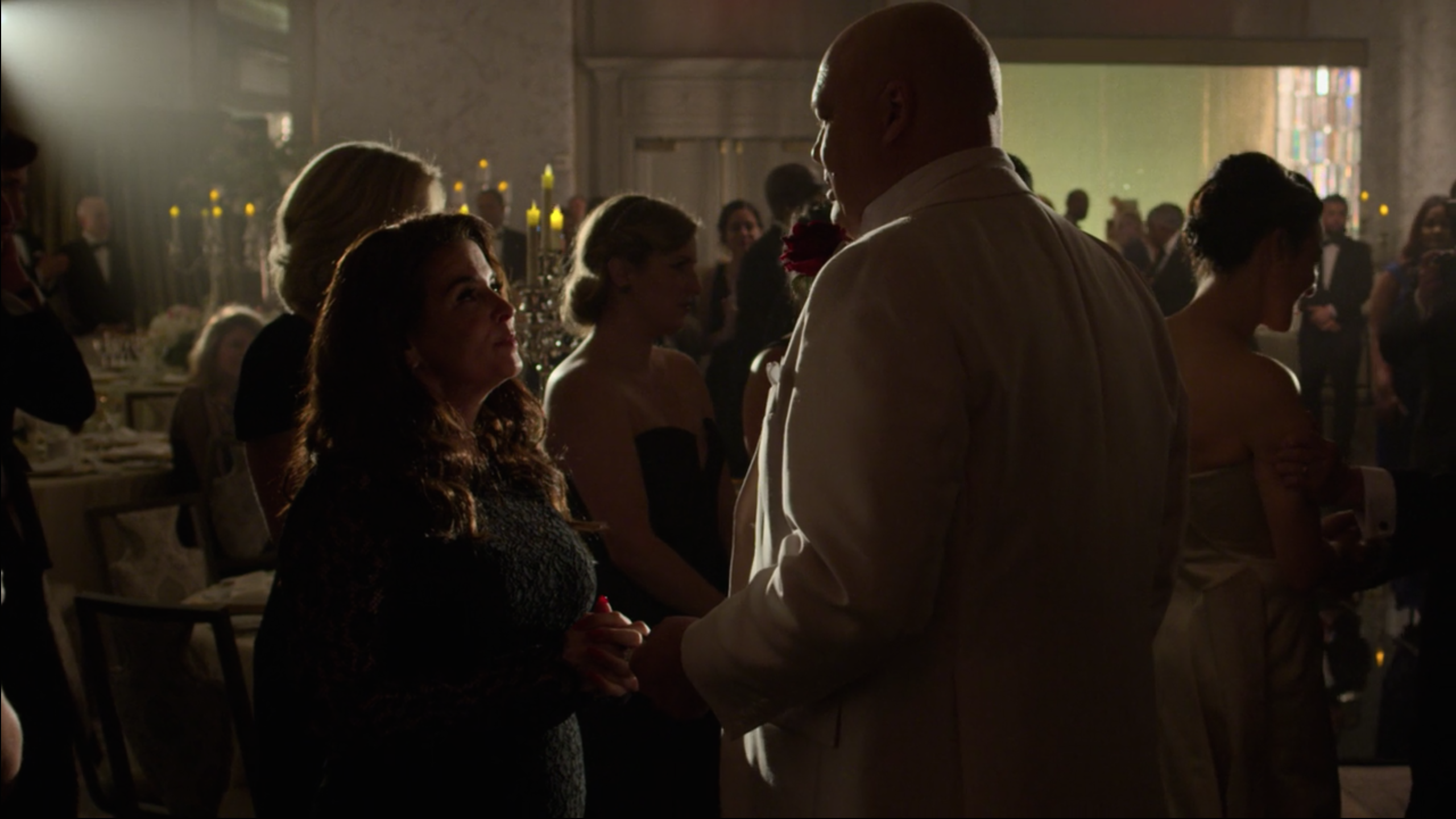 Wilson spotted a reporter taking a picture of him, so he ordered Connor Powell to deal with him. Wilson met with more of the elite and proceeded to threaten them into supporting his project. Later on, Wilson saw Murdock heading directly for him, but the confrontation was interrupted when a spotlight was cast on Wilson. Vanessa arrived at Wilson's side and told him it was time for their first dance. The couple took to the middle of the room and began dancing, and were soon joined by others, including Murdock and Glenn. As they all danced, Wilson whispered so only Murdock would hear, stating that there would be consequences for his return as Daredevil.
