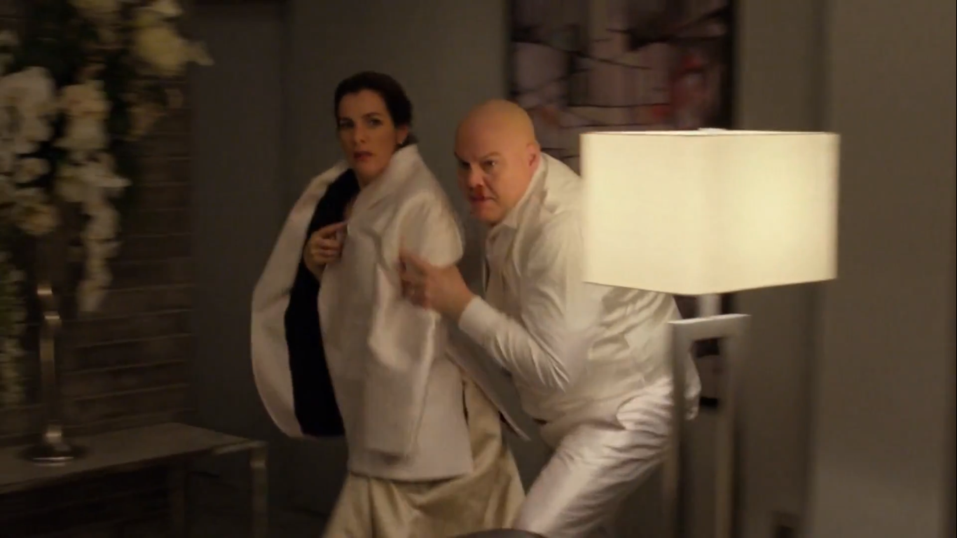 The night, Wilson got dressed for the meeting with New York's elite and was joined by Vanessa Fisk, who he informed about Luca's visit. Wilson then explained how politics has its similarities to the crime world, as it was about finding what someone wanted, and either providing it or withholding it to get them to do anything. However, Vanessa explained that it was different tonight, as Wilson had to ask the elite for money, so she educated him on how to deal with them. As Vanessa helped Wilson with his suit jacket, it ripped, as he had put on some weight.