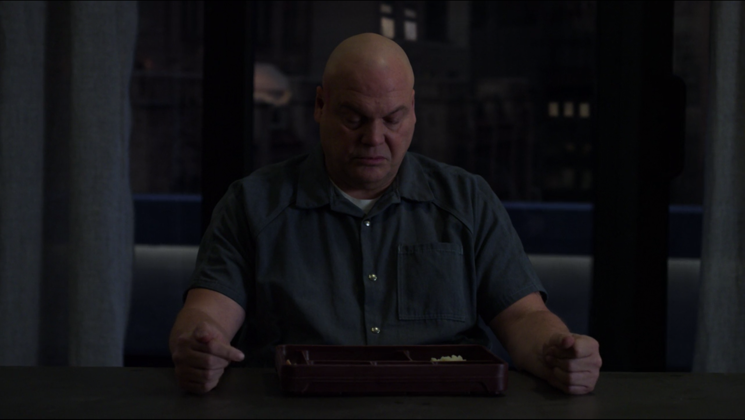 Once he had gotten out of bed, Fisk would then immediately begin his daily routine, starting by making himself the same breakfast which he made every morning, eating it alone while overlooking his view of the New York City skyline. Once he had eaten, Fisk then began putting on a similar black suit with his father's cufflinks. Often as he would look in the mirror, he would see his reflection as his younger self, covered in his dead father's blood and wielding the hammer Fisk killed him with. Staring at this vision in his reflection, Fisk chose to ignore the horrific image and instead shut off the light before leaving his Penthouse to return to his work.