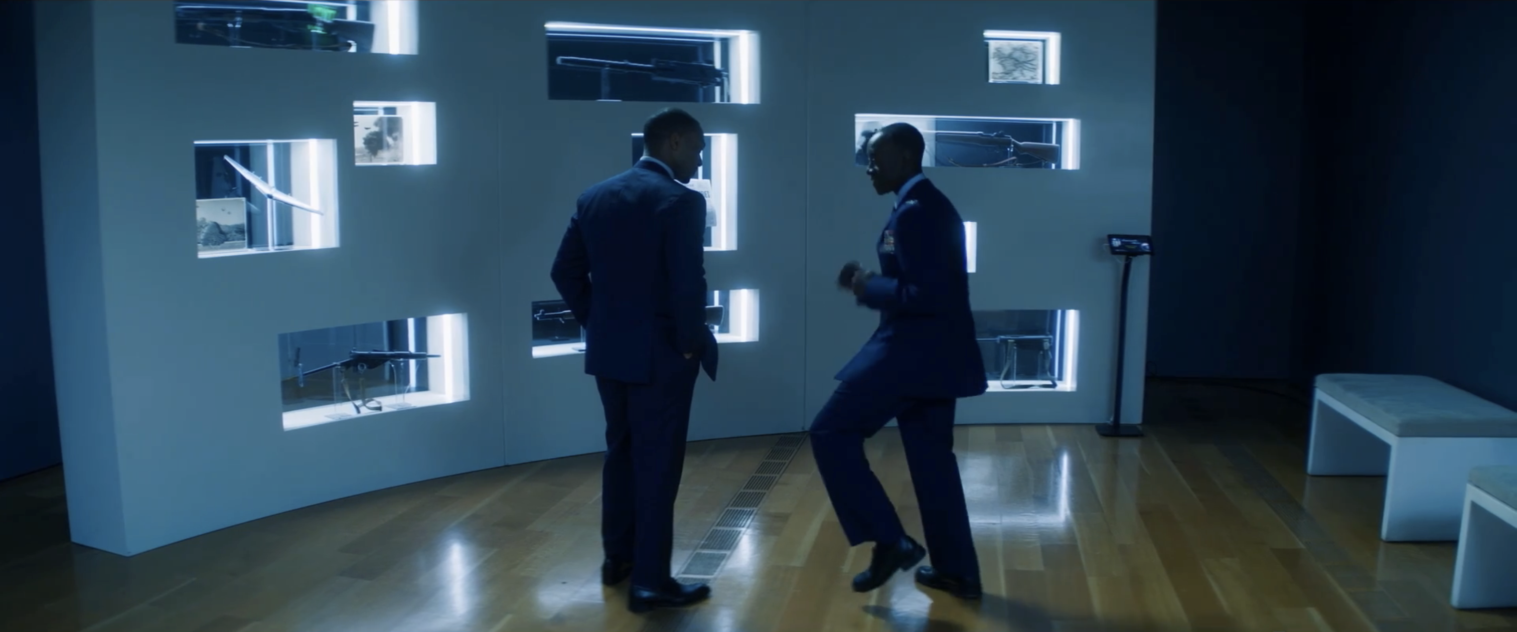 Sam Wilson and James Rhodes have a heart to heart and bond over flying. They then talk about Rhodes accident with Wilson apologizing for it. Rhodes assures him it is okay and shows off his new upgraded procedure that allows him to run now without his leg braces.