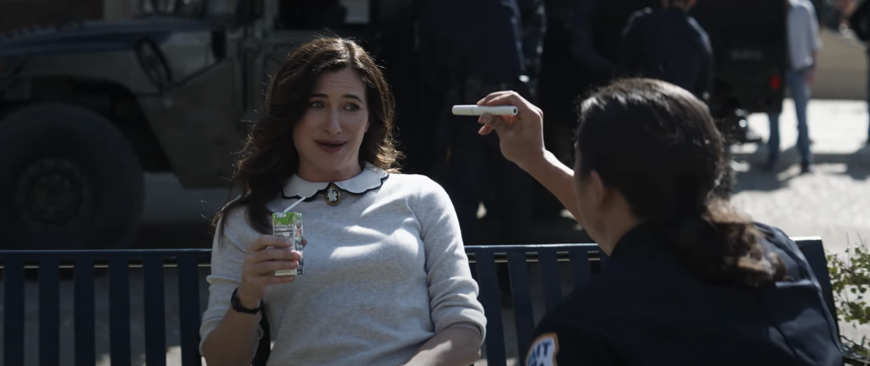 Rogers hands Officer Saunders a Chitauri Gun which he uses, finding it is effective. He then tells the other officers about this discovery.