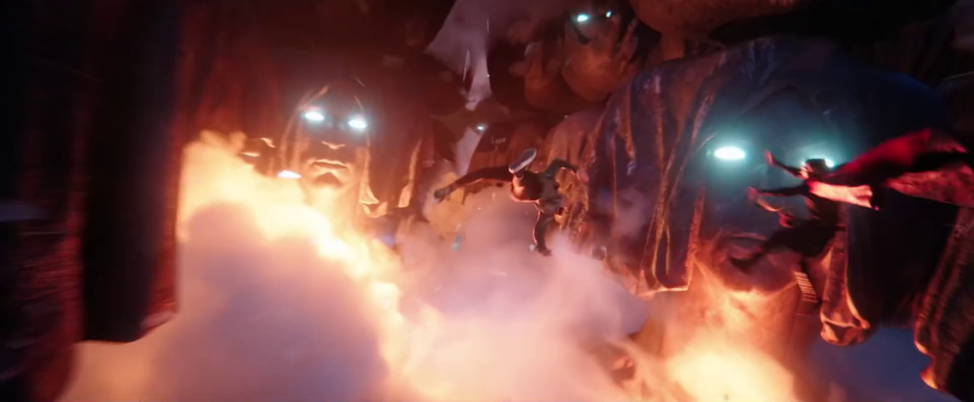 Doctor Strange and America Chavez falling past the heads of the Living Tribunal statues