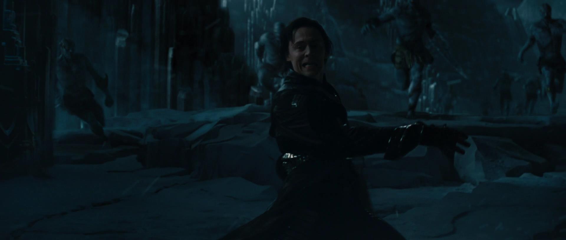 Loki throws his knives at the Frost Giants