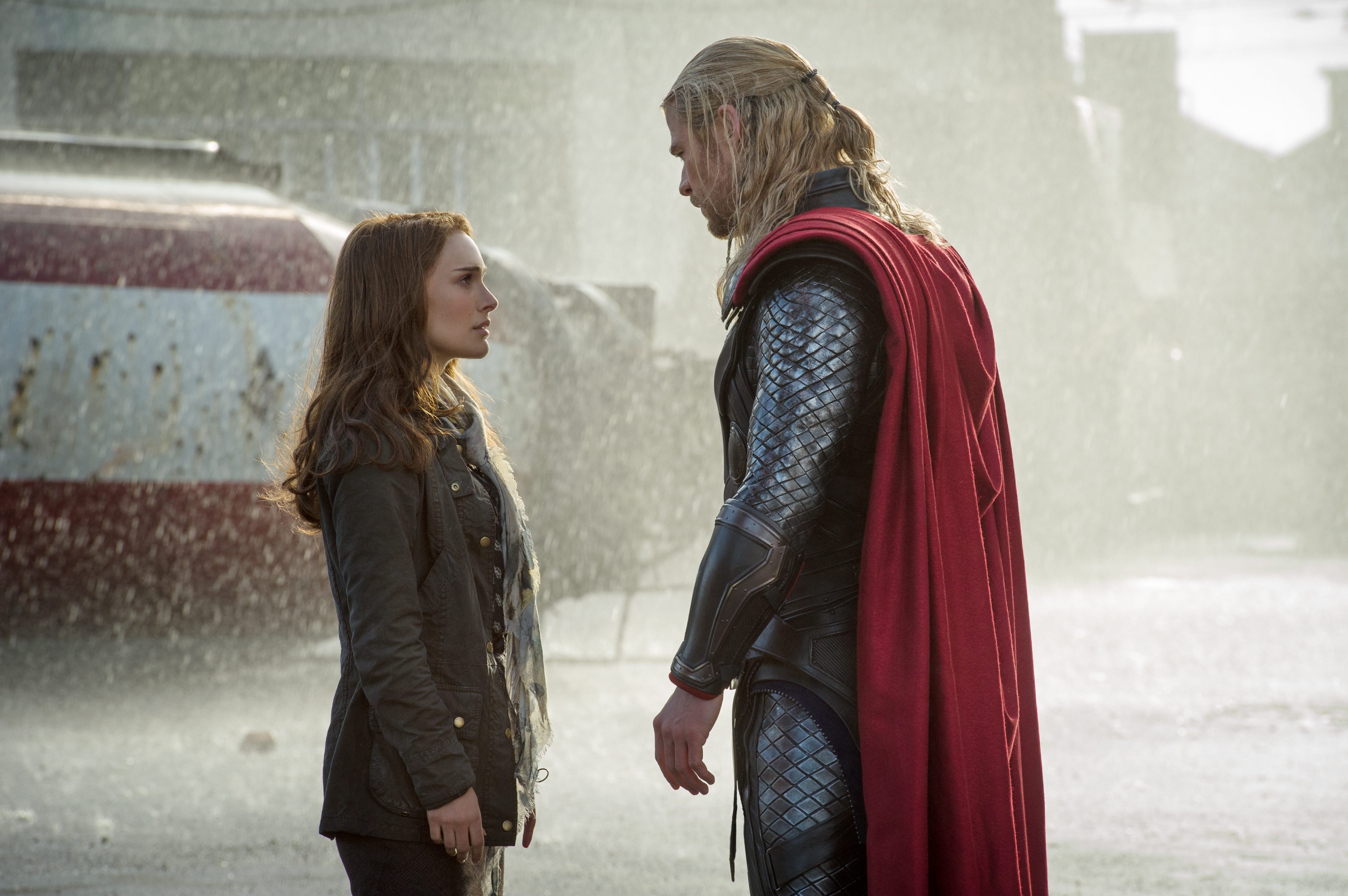 When it started to rain, Foster noticed none of it was occurring around them, to their confusion. However, the cause for strange rain occurrence was revealed when Foster spotted Thor, who had returned to Earth, standing before them. Foster then walked over to Thor, with the rain still not going on her, and slapped him to check if he was real, due to experiencing several strange occurrences that day. Now certain that it is him, Foster slapped Thor again for leaving her and never coming back even though he promised her he would.