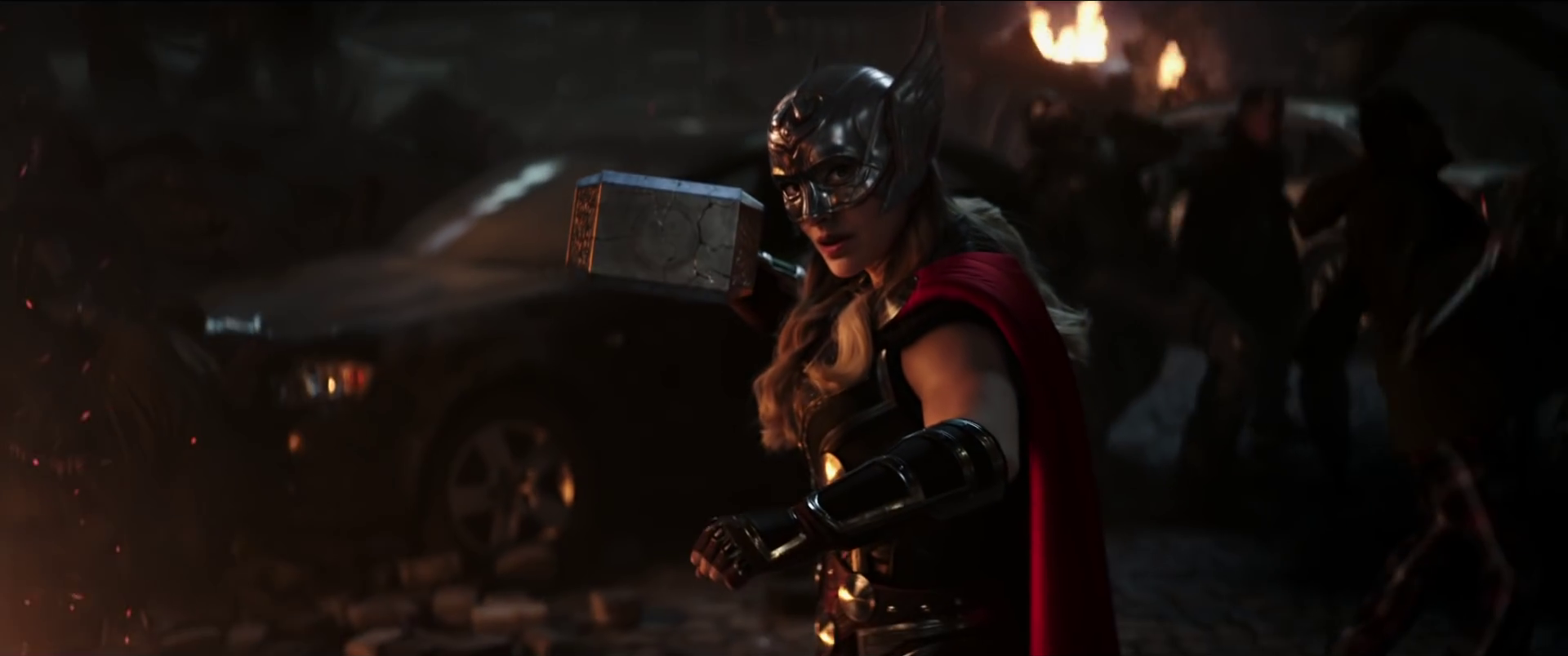 Thor demanded that she reveal herself, so Mighty Thor removed her Winged Helmet, shocking Thor to be seeing his ex-girlfriend. Completely taken aback, Thor tried to understand how she had gained his powers, but Mighty Thor insisted they talk later, as they were in the middle of a fierce battle. Mighty Thor flew off to fight off the Shadow Monsters, but when Thor came up against Gorr the God Butcher, she and Valkyrie came to his support, so Gorr retreated. They discovered that the children had been taken by Gorr, so Mighty Thor and Thor went to save them, but he escaped before they could reach them.