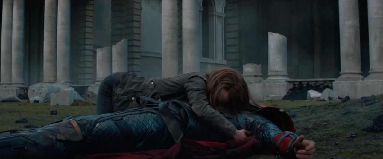 Foster watched as Thor attempted to apologize to his brother, but it did not work, and the Destroyer struck Thor, sending him flying back. Foster quickly ran to Thor's side to check on him, and he told her that she was now safe as he died from his injury, to the sadness of Foster. As she wept over Thor's body, Mjølnir began to launch from the desert and fly towards them, so Erik Selvig grabbed her and got her to safety.