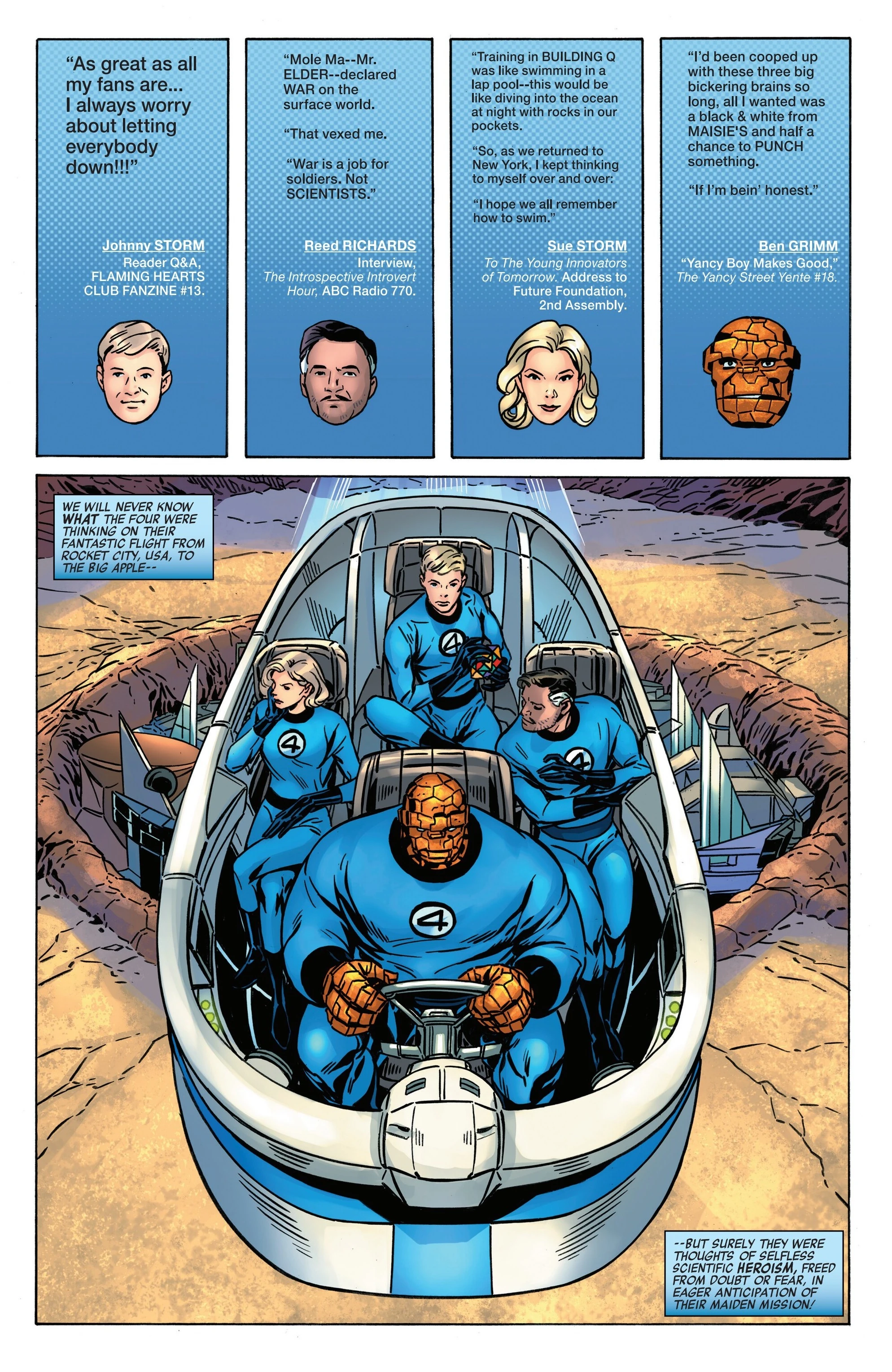 Richards was interviewed about his period of isolation and the Revolt of Subterranea many times, including by Science Dad for their magazine. Richards told Science Dad about how their period of isolation allowed them to understand their changes and ensure they were not dangerous. In an interview for Timely, Richards talked about his conflicted feelings regarding leaving Building Q for the first time, referring to the Fantastic Four as his "cohort." Sue Storm later said in a telecast that Richards intended to say "family." While talking to The Introspective Introvert Hour, Richards expressed concern with Harvey Elder, who he mistakenly called "Mole Man," declaring war on the surface world and said that scientists could not be involved in war. While on The Ted Gilbert Report, Richards said that the team's own personal discomfort during the revolt did not matter due to the need to protect the city.[1]