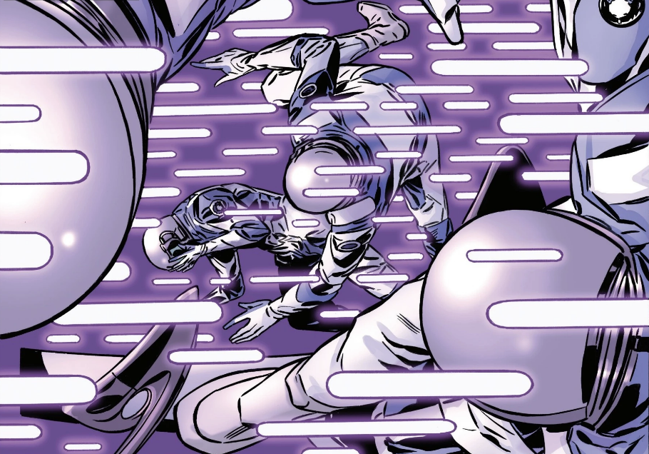 Having spent a long time in isolation, Johnny Storm asked when they would be allowed to leave. Sue Storm, referring to Richards as "Dr. Richards," made a comment about Richards not telling them how long it would be, and Richards told Sue not to be so formal with him while saying that he would indicate when it was time to leave quarantine. Meanwhile, Ben Grimm broke K.E.R.B.I.E., leading to a fight between him and Johnny. Richards attempted to intervene, getting involved in the fight as he wrapped his body around Johnny and Grimm, asking Sue for help. Sue was distracted, but then noticed what happened and put all three men in force fields, depriving of them of oxygen momentarily and forcing them to stop.