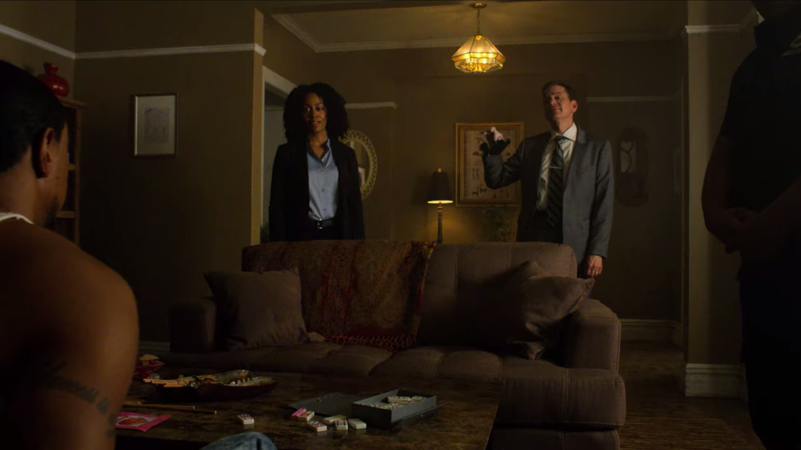 Knight rejoined the precinct and went through Tom Ridenhour's stuff. Nandi Tyler walked in saying that they had a pool for when she would return to work. Tyler gave her three days. Tyler showed respect to Knight and told her that Knight was the highest-ranking cop now. Luke Cage walked in with Mariah Dillard and Tilda Johnson as there was a threat on their life. Knight thought about the crime scene and figured out that the shot that killed Comanche had to come after Ridenhour was killed, meaning there was a third person. She suspected Dillard or Shades. Knight interrogated Dillard and brought up Ridenhour's death, thinking she had something to do with it. However, she was surprised when Dillard gasped and almost cried.